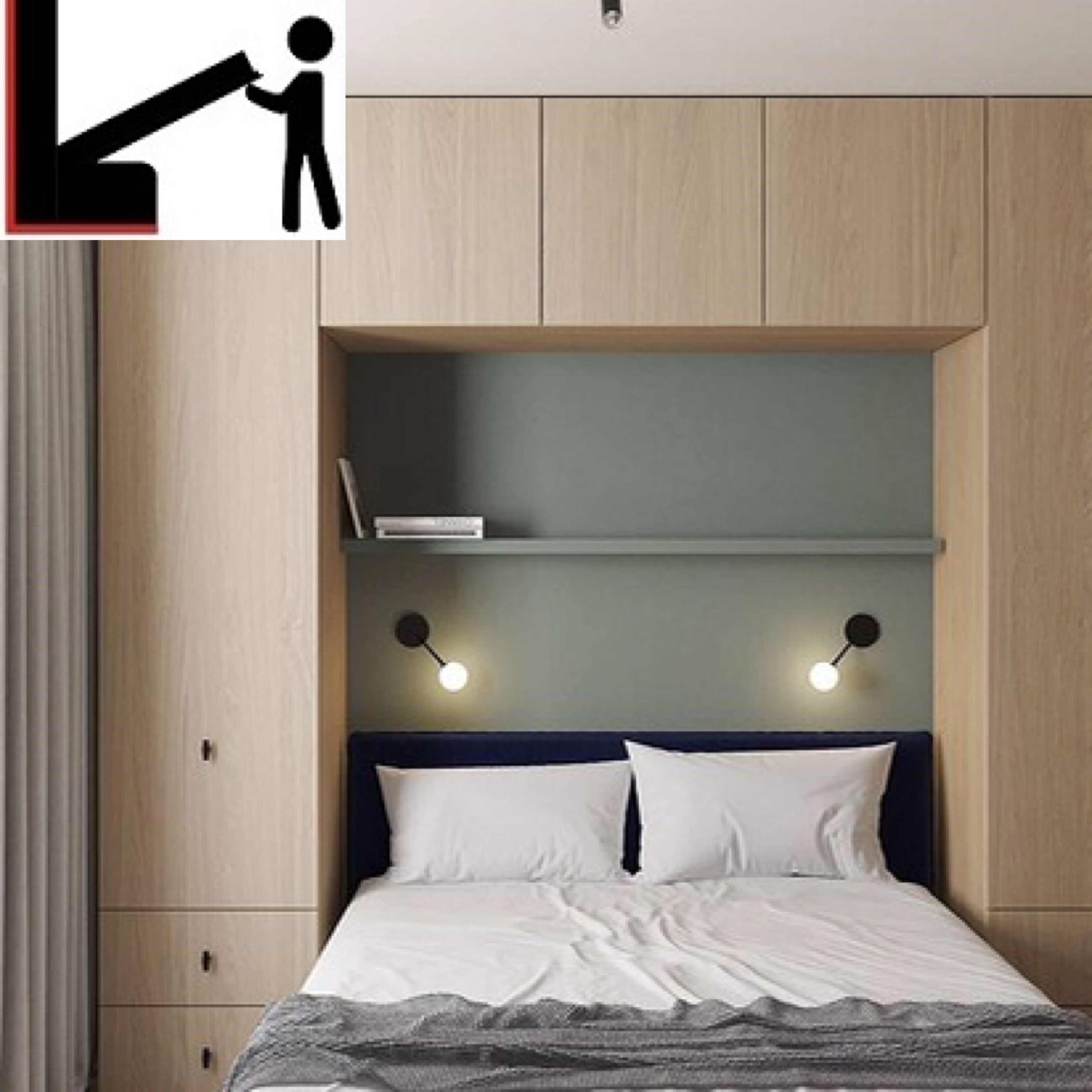 Шкаф-кровать горизонтального сложения встроен на всю ширину ниши. Материал исполнения - ЛДСП Эггер. Включает закрытые полки, шкаф со штангой и полку внутри модуля кровати.