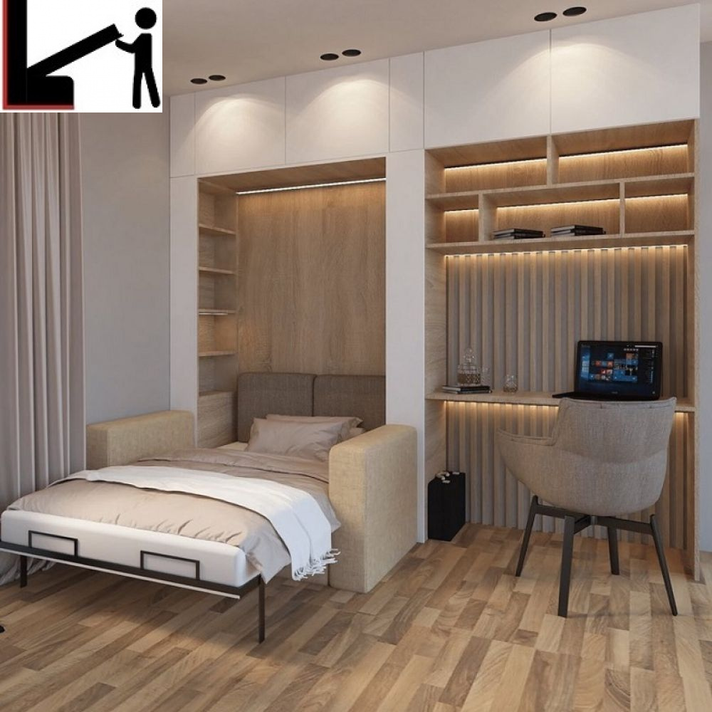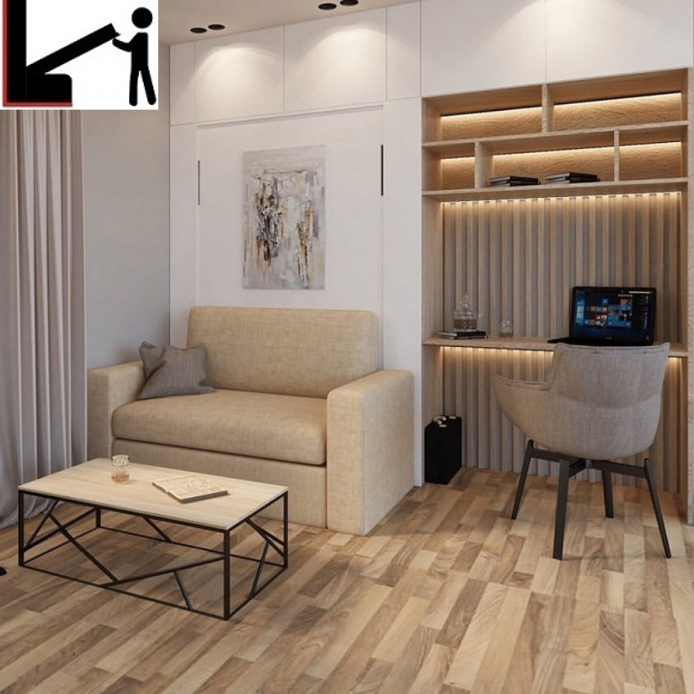 В вашем распоряжении удобный диван, шкаф-кровать и полочное пространство для хранения вещей.