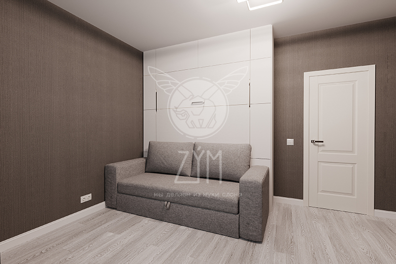Шкаф-кровать из ЛДСП Egger дополнен удобным диваном. В комплекте мягкая стеновая панель и подсветка. Внутри есть открытые ниши и закрытые секции для хранения.