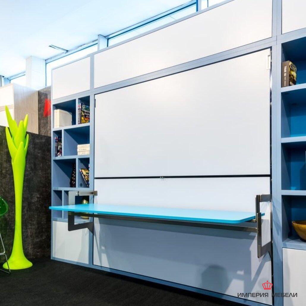 Детская кровать горизонтального сложения с навесным модулем из четырех полок.