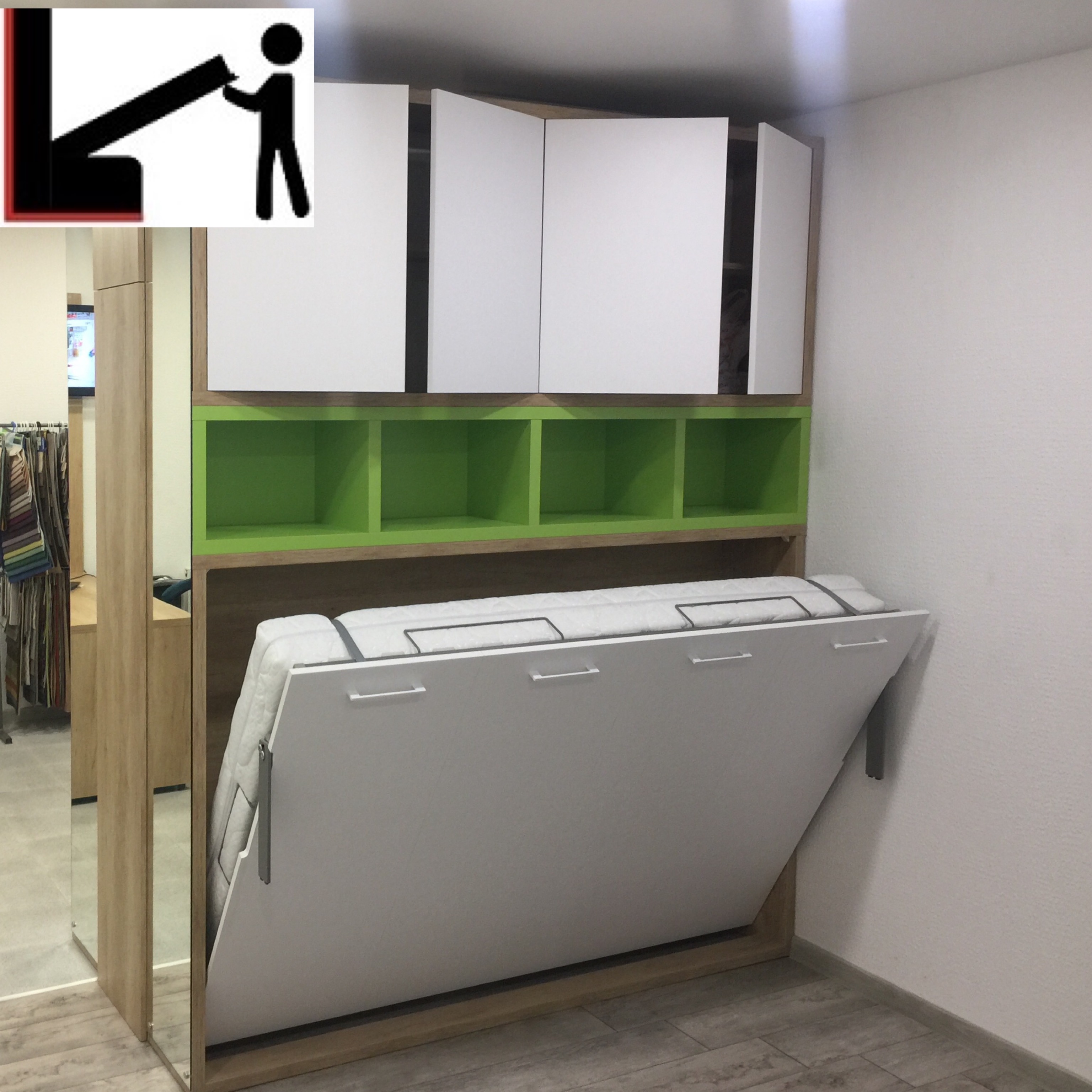 Мебель-трансформер с кроватью вертикального сложения с интегрированной полкой. Включает подсветку, мягкое изголовье и много зон хранения.