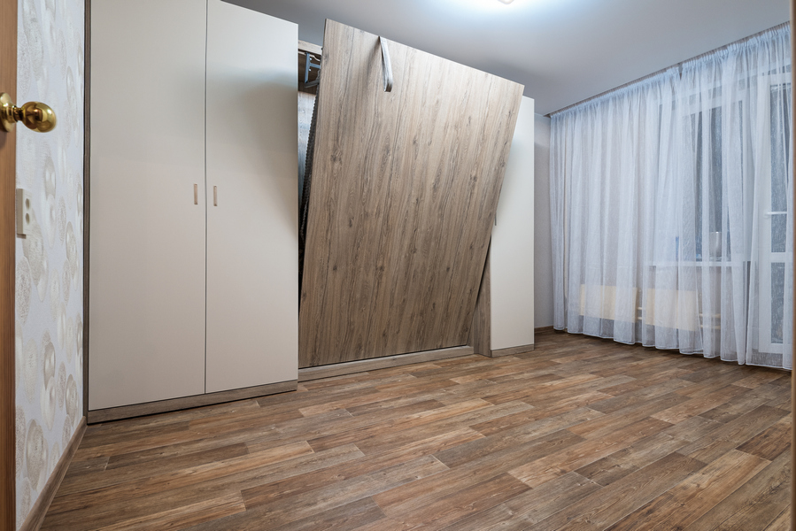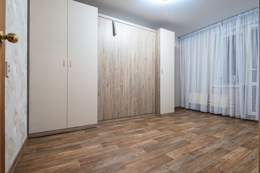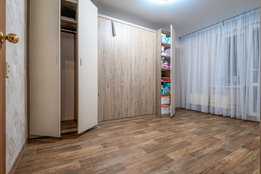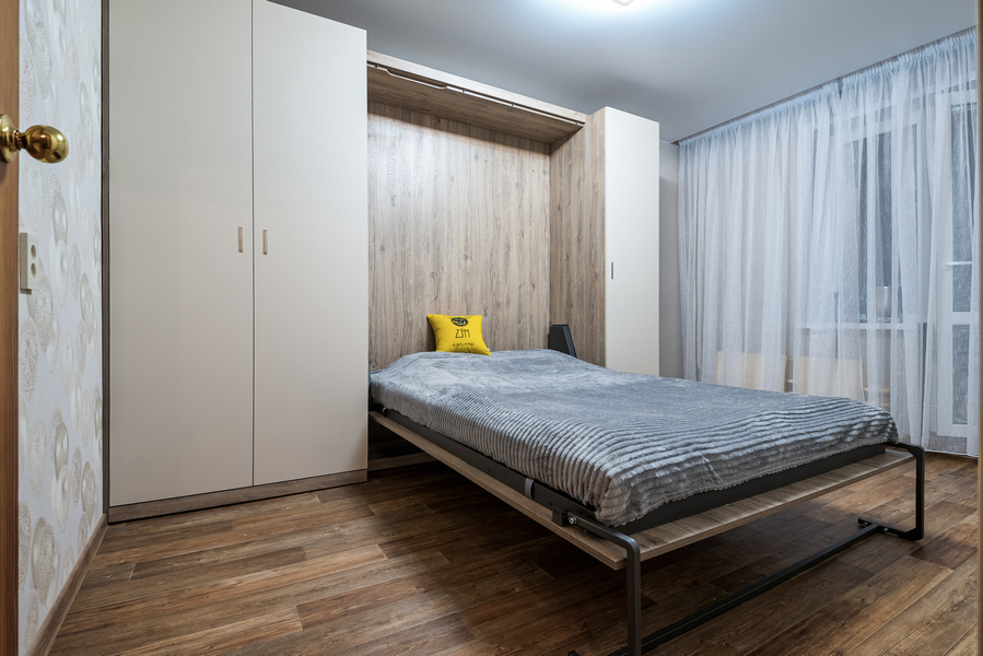 Шкаф-кровать горизонтального сложения встроен на всю ширину ниши. Материал исполнения - ЛДСП Эггер. Включает закрытые полки, шкаф со штангой и полку внутри модуля кровати.