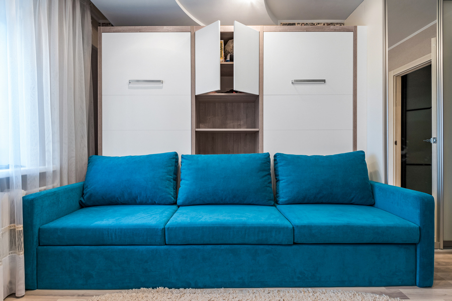 Мебель-трансформер со шкафом-кроватью горизонтального сложения. Включает шкаф, зоны хранения, диван и консоль под TV.
