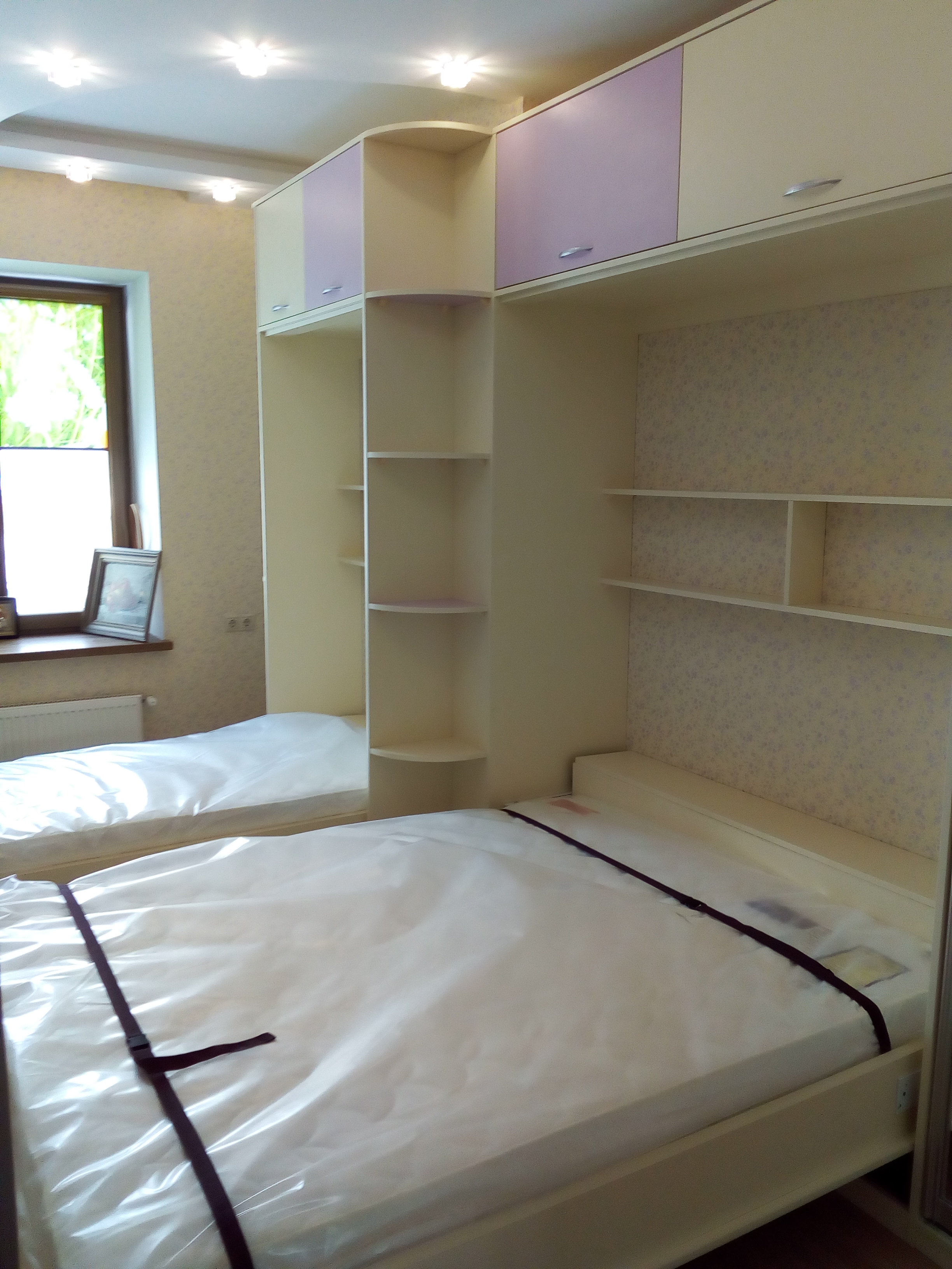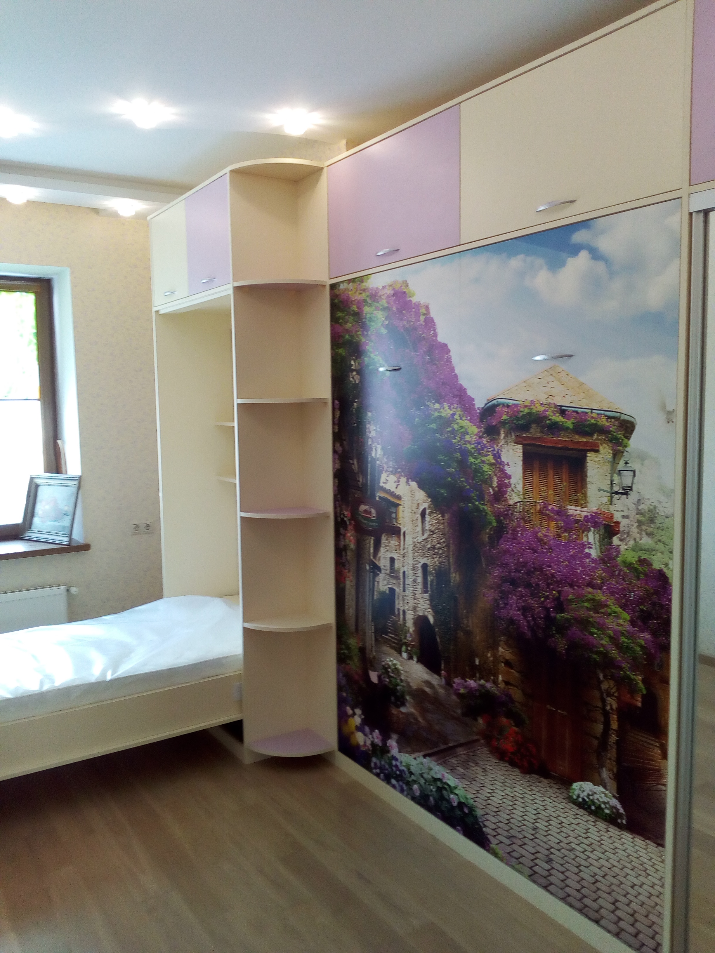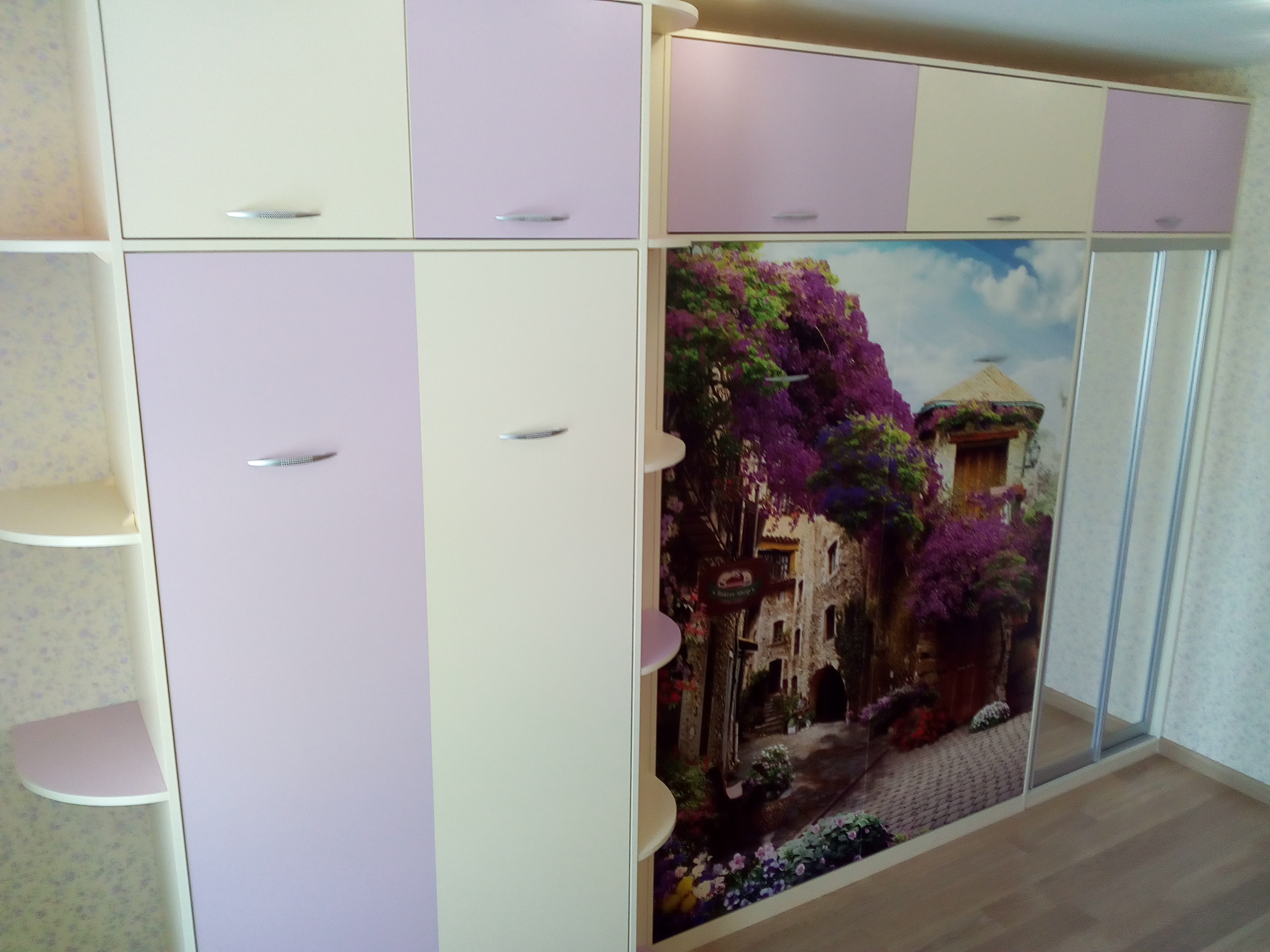 Фасад стенки выполнен в легких цветах с яркой фотопечатью и зеркалом. Модель дополняется двумя откидными кроватями - односпальной и двухспальной. Помимо них в функционал стенки входят антресоли для хранения вещей и боковые полки для разных аксессуаров.