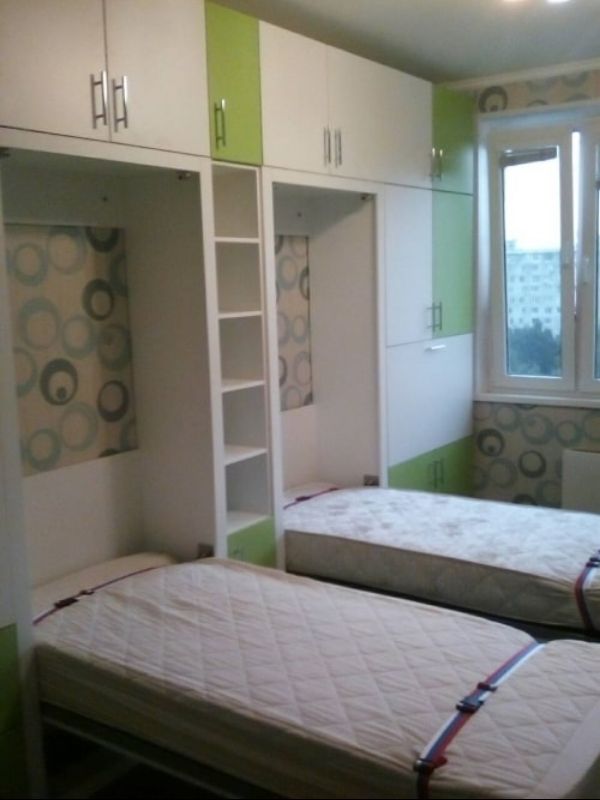 Кровать-трансформер с горизонтальным механизмом раскладывания встроена в шкаф с закрытыми полками в пределах доступности ребенка. Материал детской - крашенный МДФ.