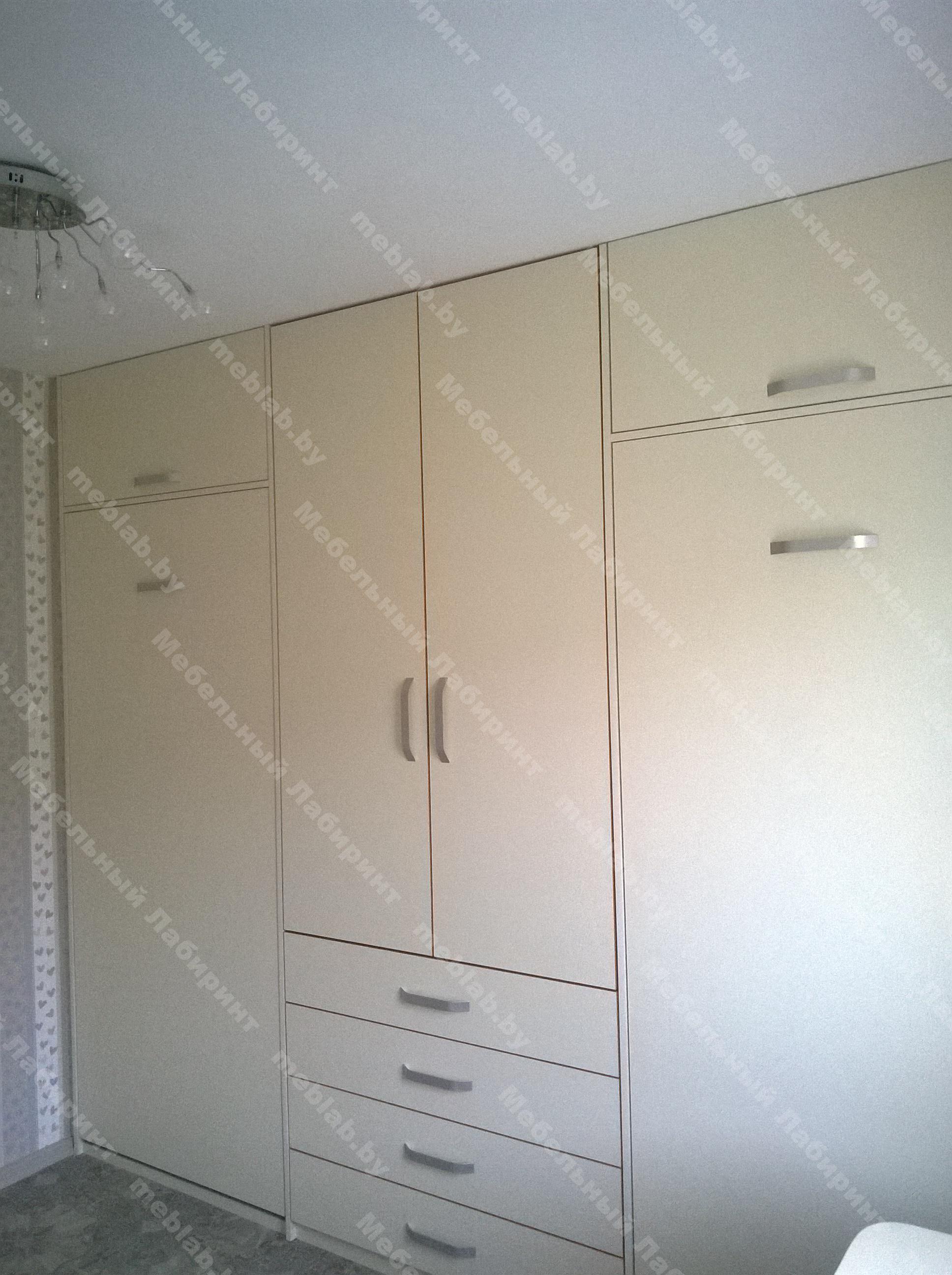 Односпальная кровать-трансформер. Горизонтальная трансформация. Дополняется шкафом, столом и комодом на заказ по индивидуальным размерам. Широкий выбор материалов.