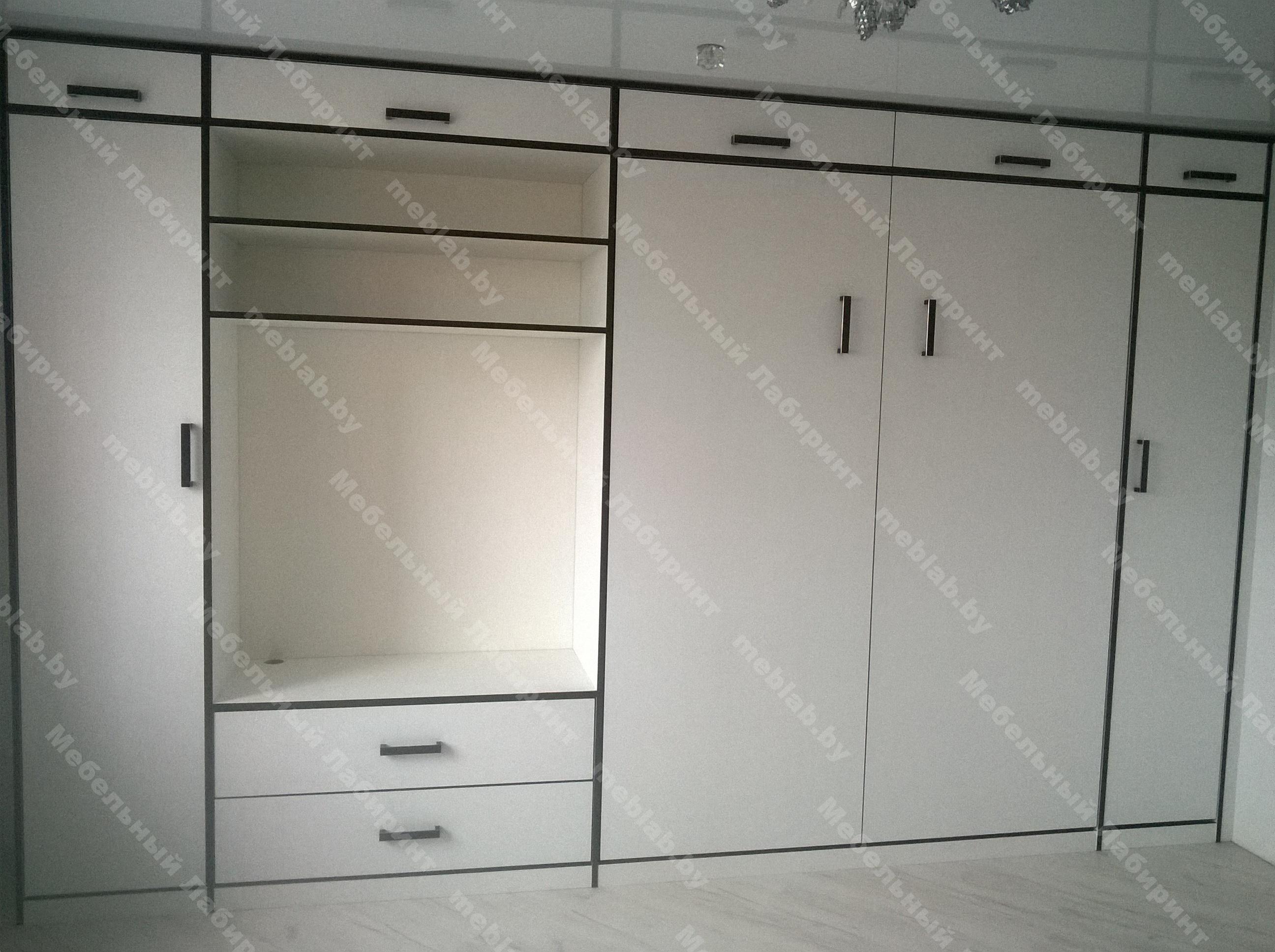 код 89917Белый фасад с контрастной кромкой. Ниша для ТВ. Шкафчики с антресолью.