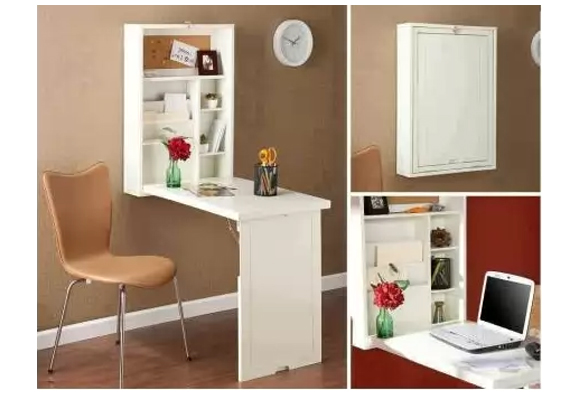 Стол обладает оригинальным строением конструкции. Он представляет собой настенный элемент декора белого цвета в сложенном состоянии. Но легко трансформируется в стол с прямоугольной столешницей и полками открытого типа. Такое дизайнерское решение отлично подойдет для небольших комнат.