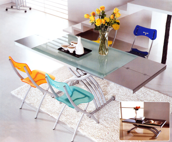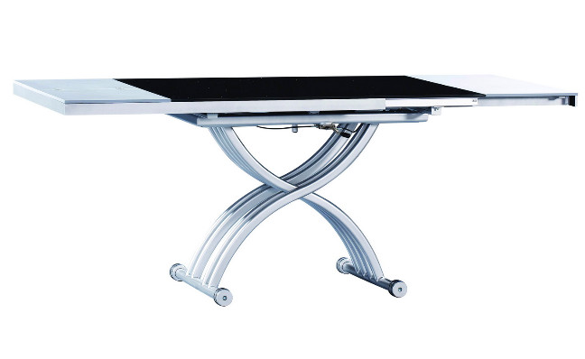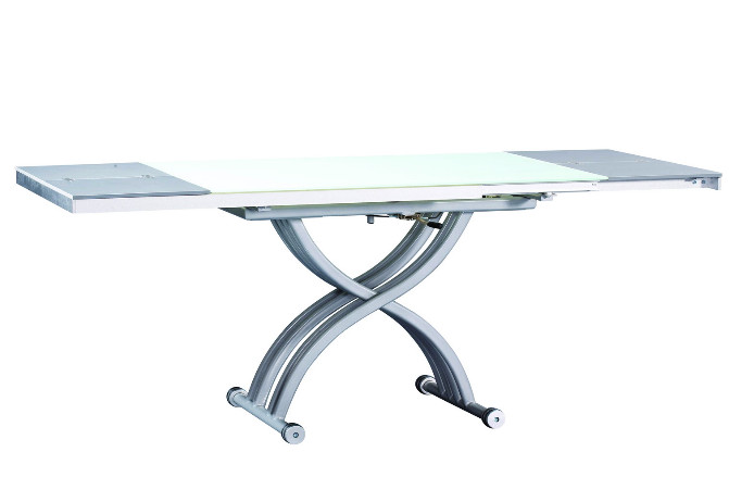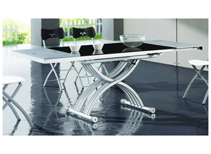 Столешница выполнена закалённого стекла. Стол с механизмом трансформации из обеденного в журнальный.