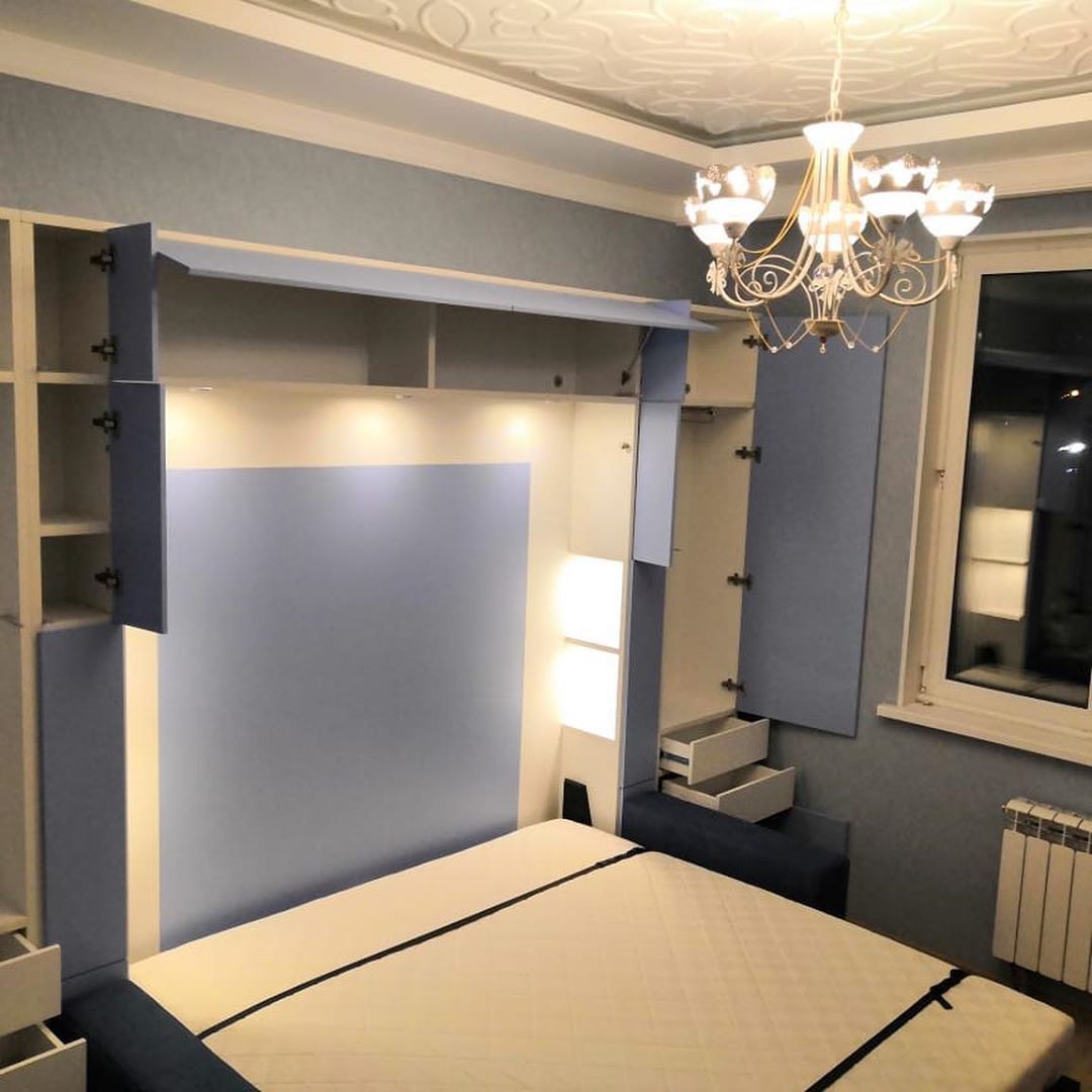 Встроенная мебель с трансформером из ЛДСП с диваном, открытыми и закрытыми зонами хранения, мягким изголовьем и зашивкой газовых лифтов.