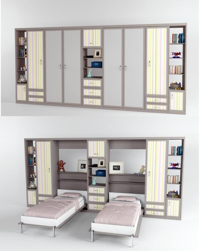 Представленная модель трансформируемой мебели оснащена двумя односпальными кроватями. Широкий шкаф удобен для размещения в небольшой комнате. Откидной механизм спальных мест позволяет существенно сэкономить место в дневное время суток.