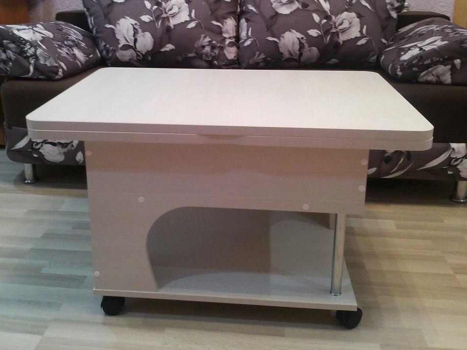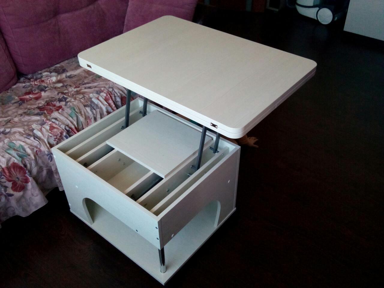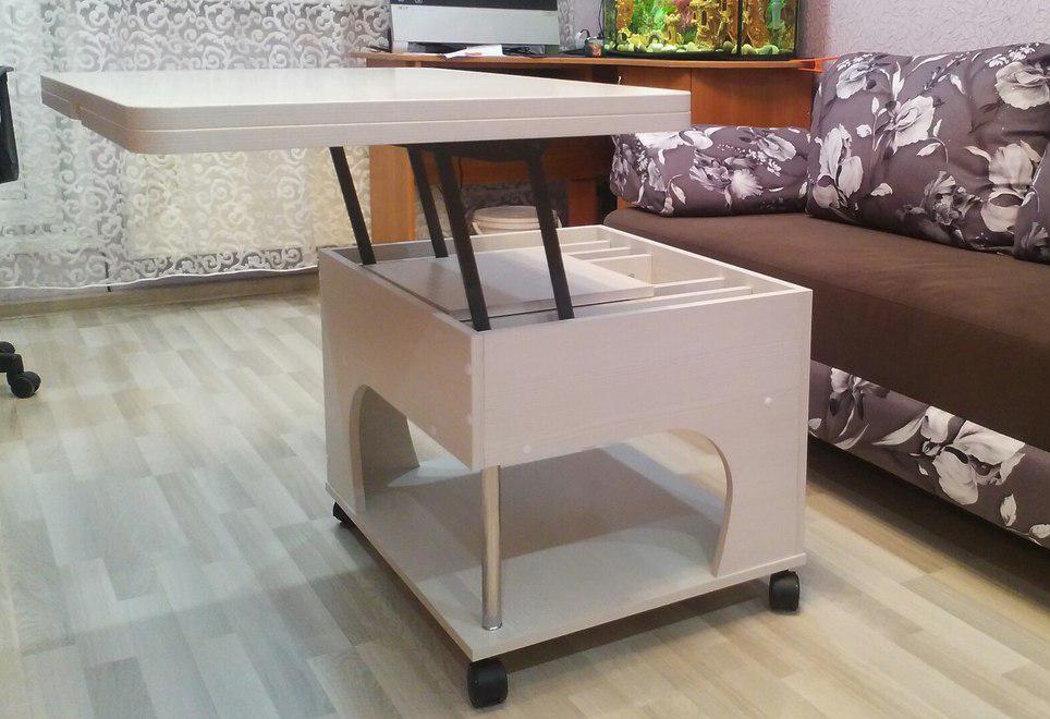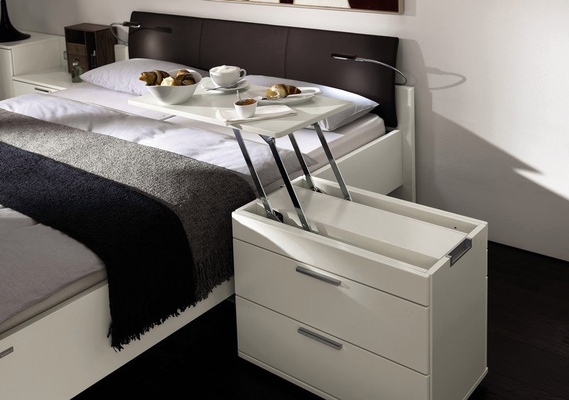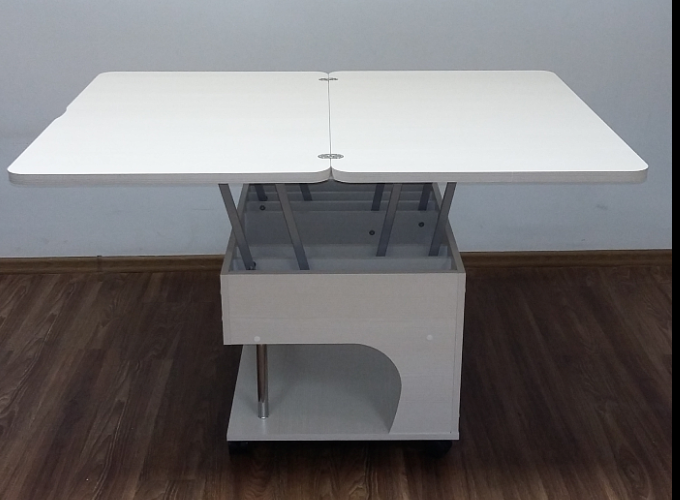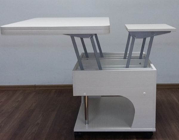 Тумба отличается креативным дизайном и встроенным в нее сервировочным столиком. Особенность столика в том, что он может складываться из разных частей и, например, быть маленьким столиком, или быть собранным из двух столешниц в один большой стол. Тумбочка оснащается двумя выдвижными ящиками и колесиками, поэтому ее очень легко перевозить с места на место.