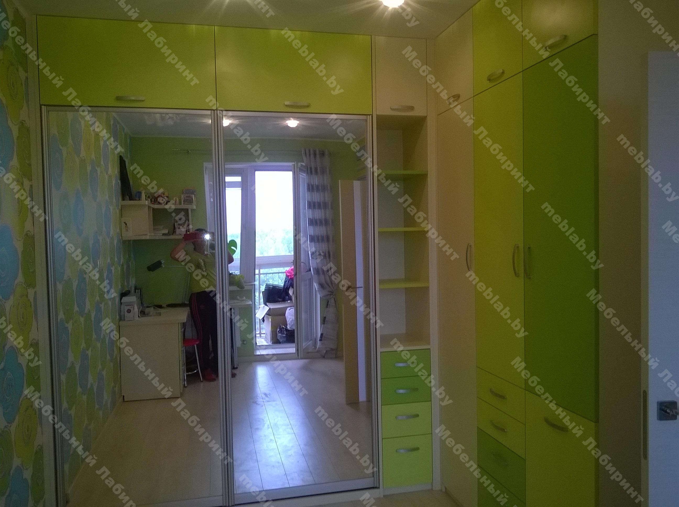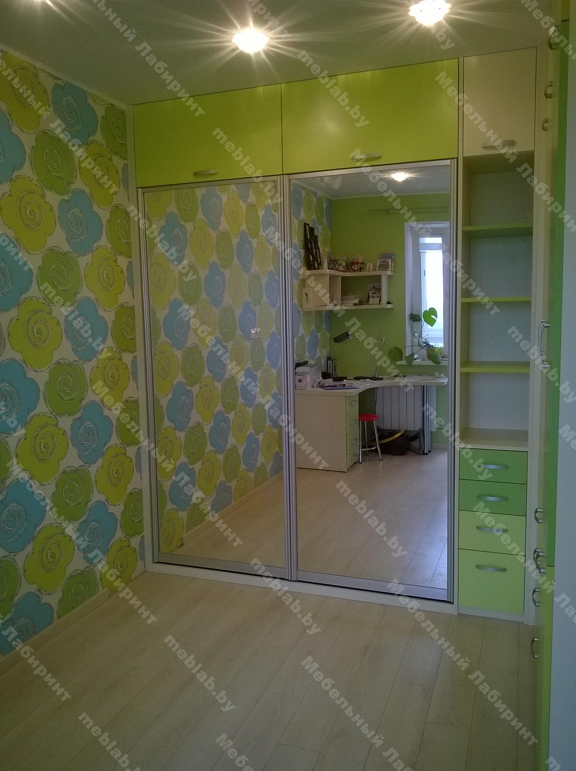 Угловой шкаф в приятной яркой расцветке салатового, зеленого и бежевого тонов с открытым стеллажом, антресолями, отделами на распашных дверцах и множеством выдвижных ящиков. При сложенной откидной кровати с большим спальным местом образуется много свободного места с двумя высокими зеркалами в серебристом профиле, в тон ручкам на фасаде. Шкаф функционально и гармонично впишется в ограниченное пространство спальни или детской комнаты для школьника или студента.