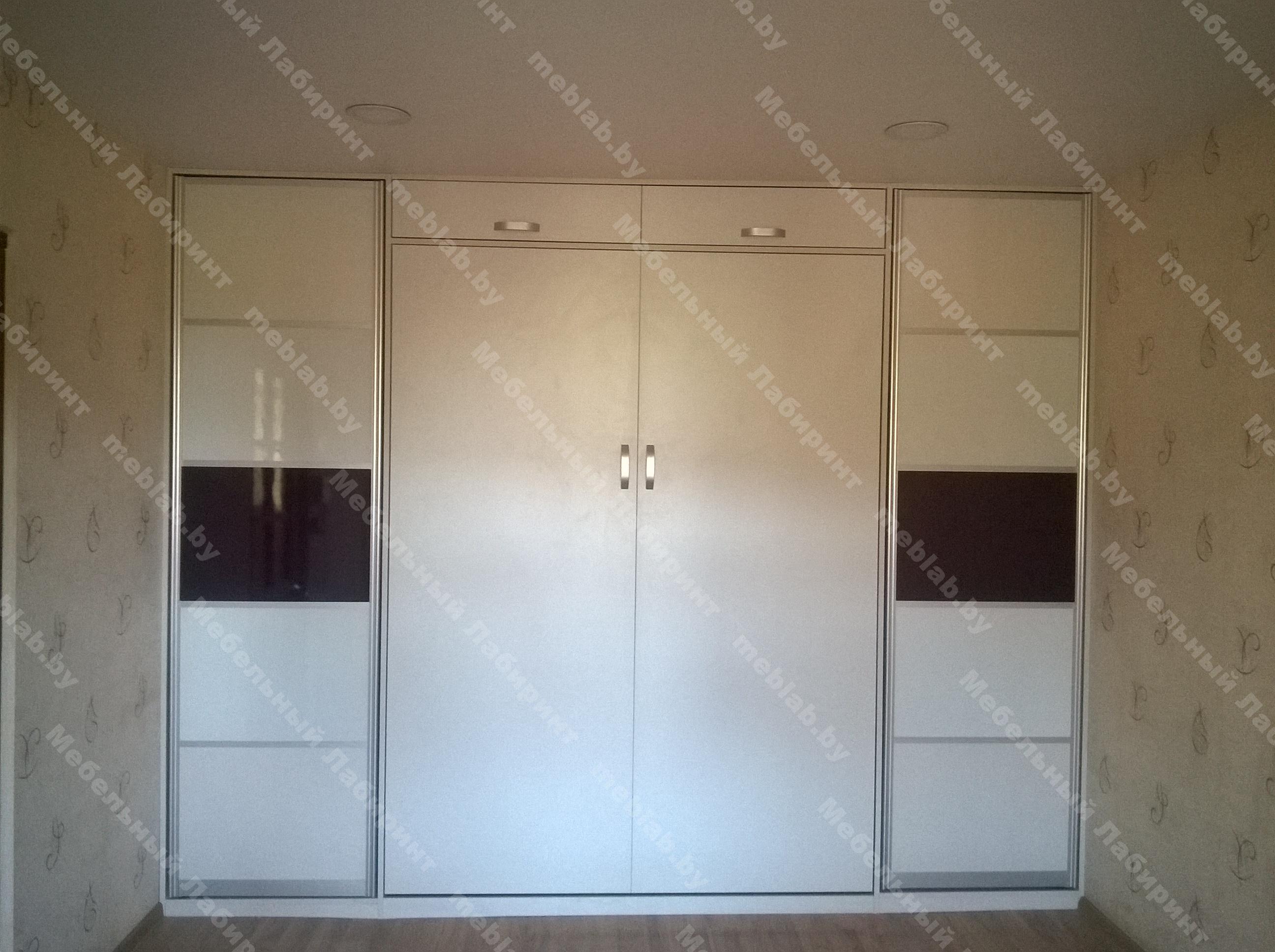 Встроенный шкаф с модулем откидной кровати. Две антресоли и гардеробные отделы по бокам от спального места создают над ним уютную арку с навесными полками. Удобное наполнение достигается за счет наличия планок для вешалок, нескольких полок и тумбочек с выдвижными ящиками. Распашные дверцы фасада комбинируют в себе полоски глянцевого лакобеля белого и черного цветов. Надежный механизм не составит проблем в использовании.