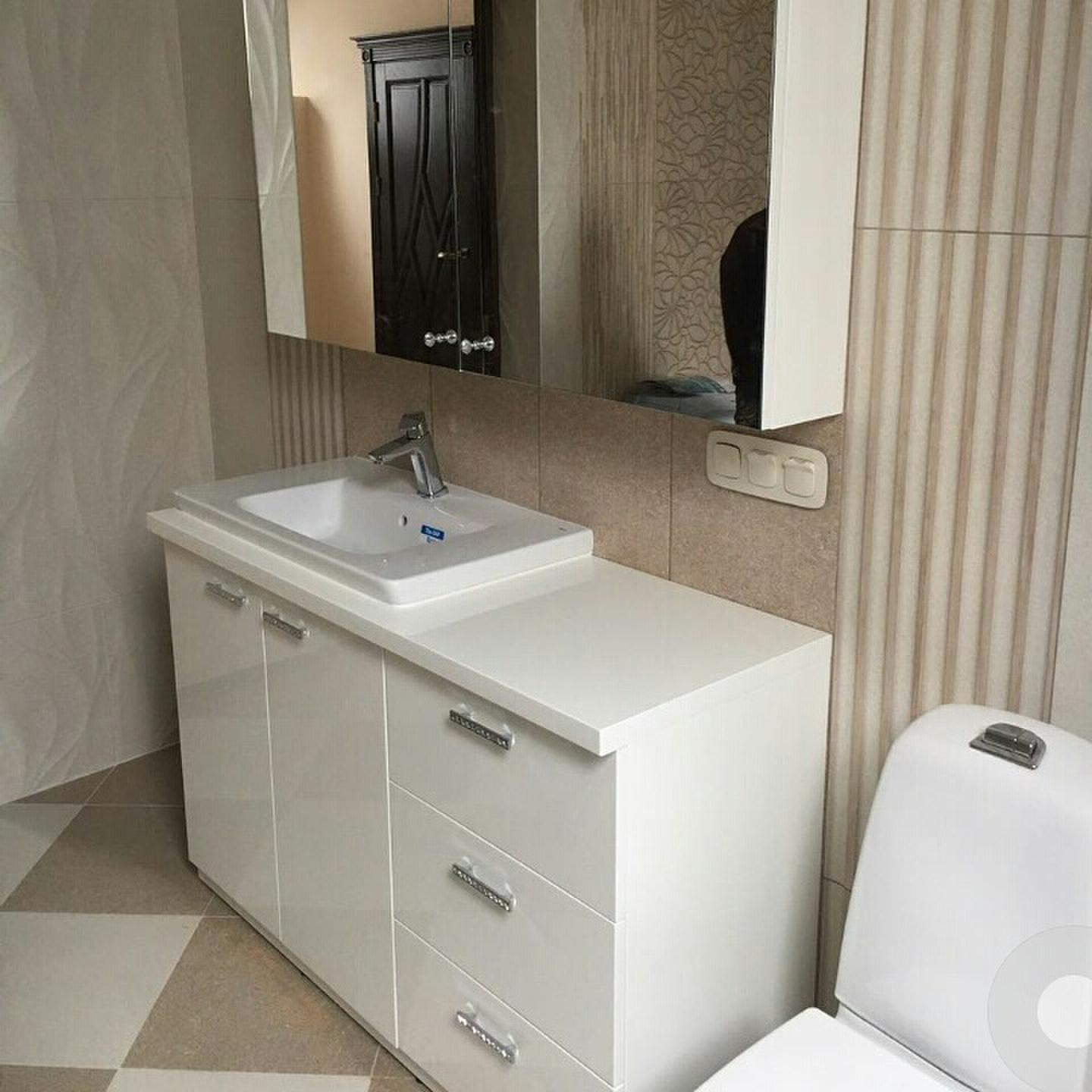 Белая тумба под умывальник. Дизайн в классическом стиле. Круглые ручки выдвижных ящиков. Изготовление по вашим размерам. Качественные и долговечные материалы.