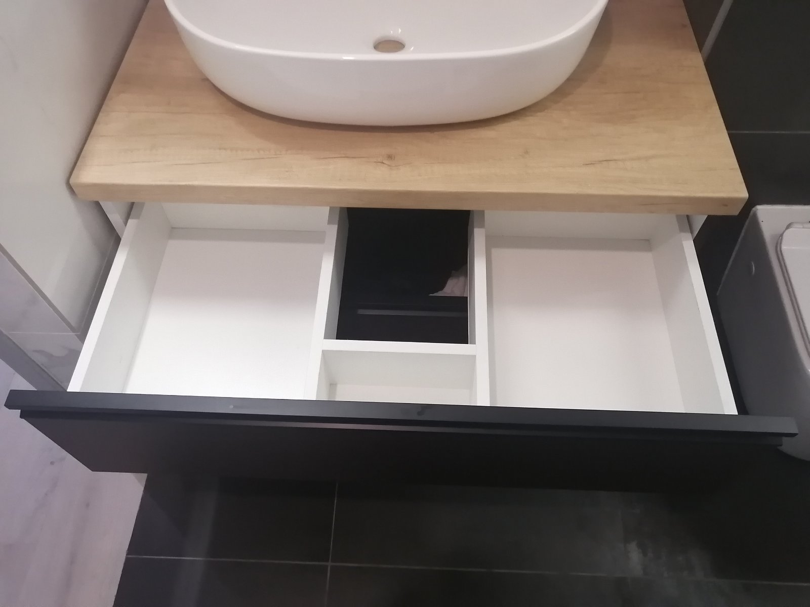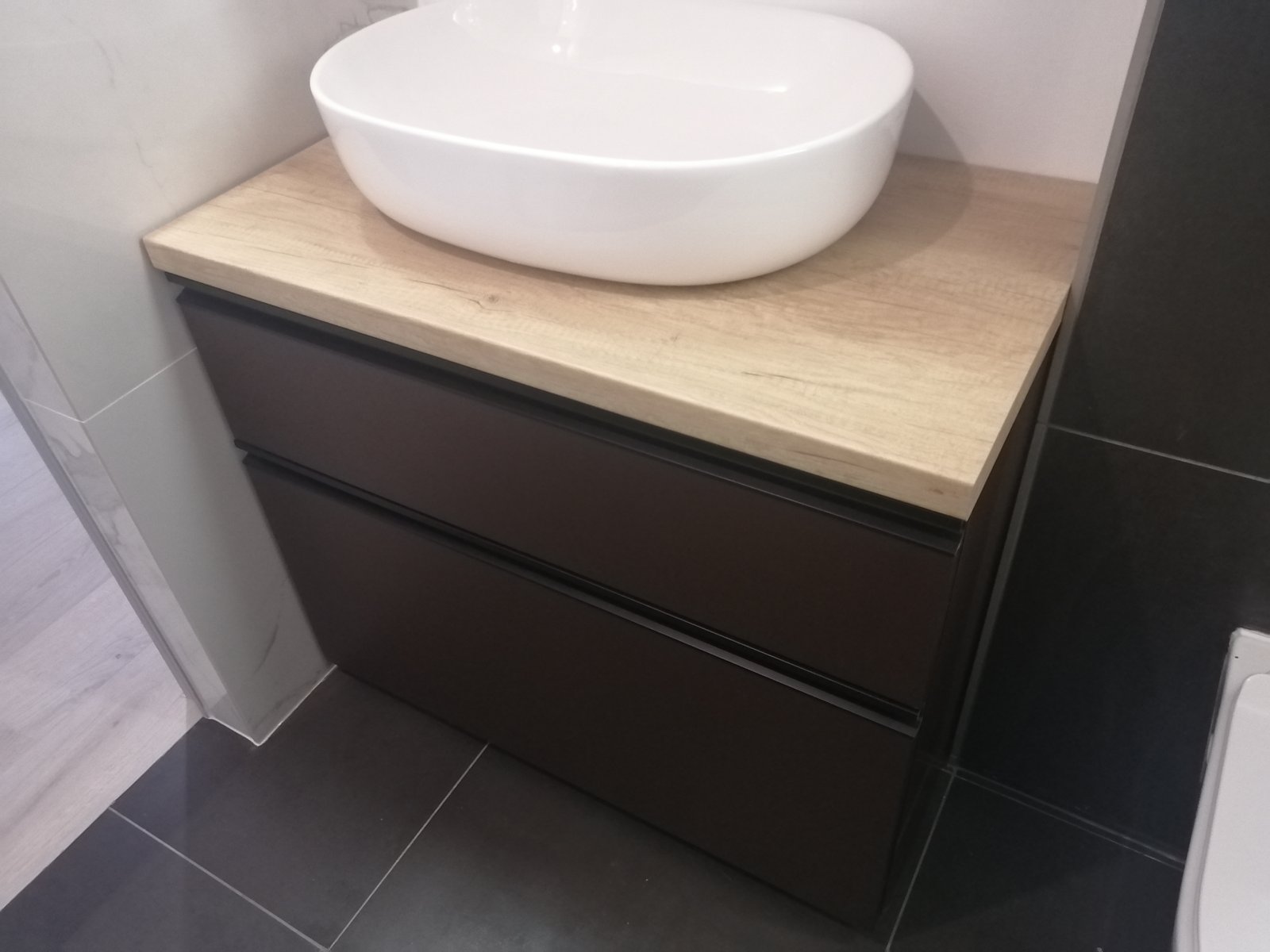 Тумба для ванной комнаты под умывальник. Фасады АГТ. Столешница постформинг. Направляющие тандем BLUM полного выдвижения. Врезная профильная ручка. Размеры: 700*800*550. Цена без учета стоимости умывальника.