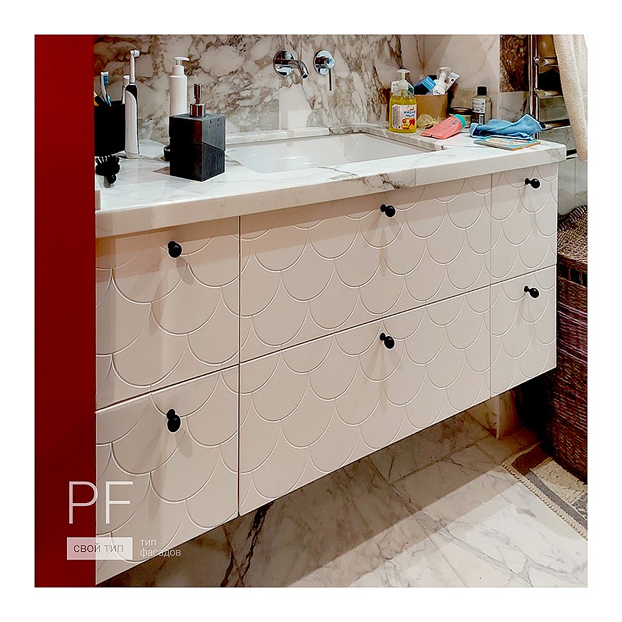 Красивая, стильная тумба с декоративной фрезеровкой в виде чешуек на фасадах мягкого матового цвета и контрастными аккуратными ручками-кнопками. Тумба подвесная и имеет ряд преимуществ. Она зрительно увеличивает пространство, позволяет без труда сделать уборку, придает комнате современный вид, исключает возможность затопления мебели, позволяет отлично циркулировать воздуху. Установку такой тумбы лучше доверить профессионалам, так как процесс монтажа непростой, надо учесть не только конструктив мебели, но и нагрузку и материал стены.