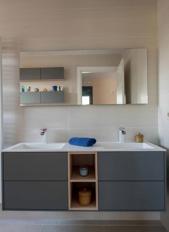 Тумба оснащена тремя выдвижными ящиками, шкафчиком и открытыми нишами.