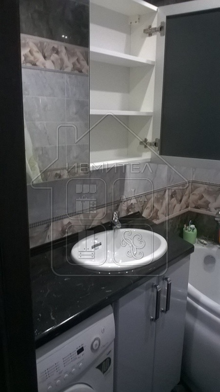 Сочетание черного и серого – очень стильное решение для ванной комнаты. Фасад выполнен в сером цвете, столешница из постформинга в черном мраморе.