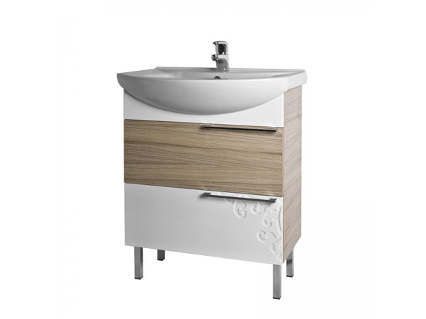 Тумба оснащена двумя распашными шкафчиками и выдвижными ящиками. Фурнитура со стразами.