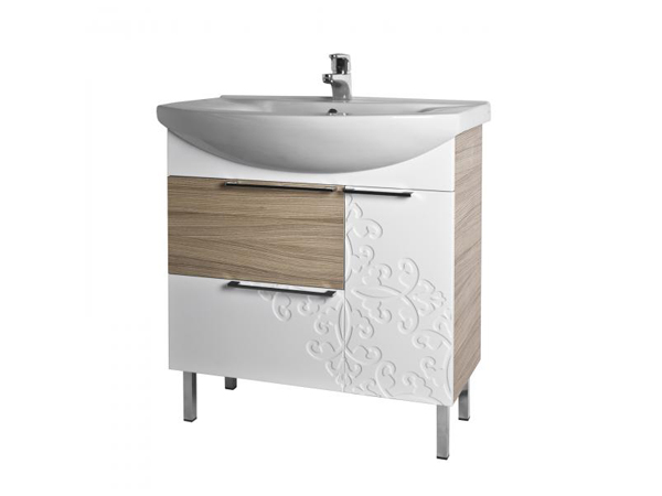 Белая тумба под умывальник. Дизайн в классическом стиле. Круглые ручки выдвижных ящиков. Изготовление по вашим размерам. Качественные и долговечные материалы.