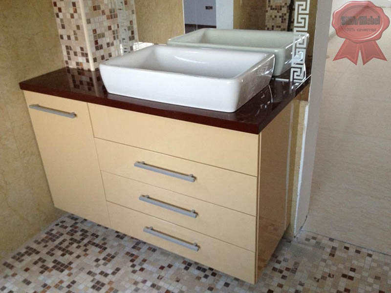 Современная тумба украсит обстановку любой ванной комнаты. Модель имеет несколько выдвижных ящиков и полку с распашной дверцей для хранения различных вещей. Эффектная глянцевая столешница выполнена в темном цвете и отлично гармонирует со светлой расцветкой фасадов. На столешницу устанавливается чаша умывальника.
