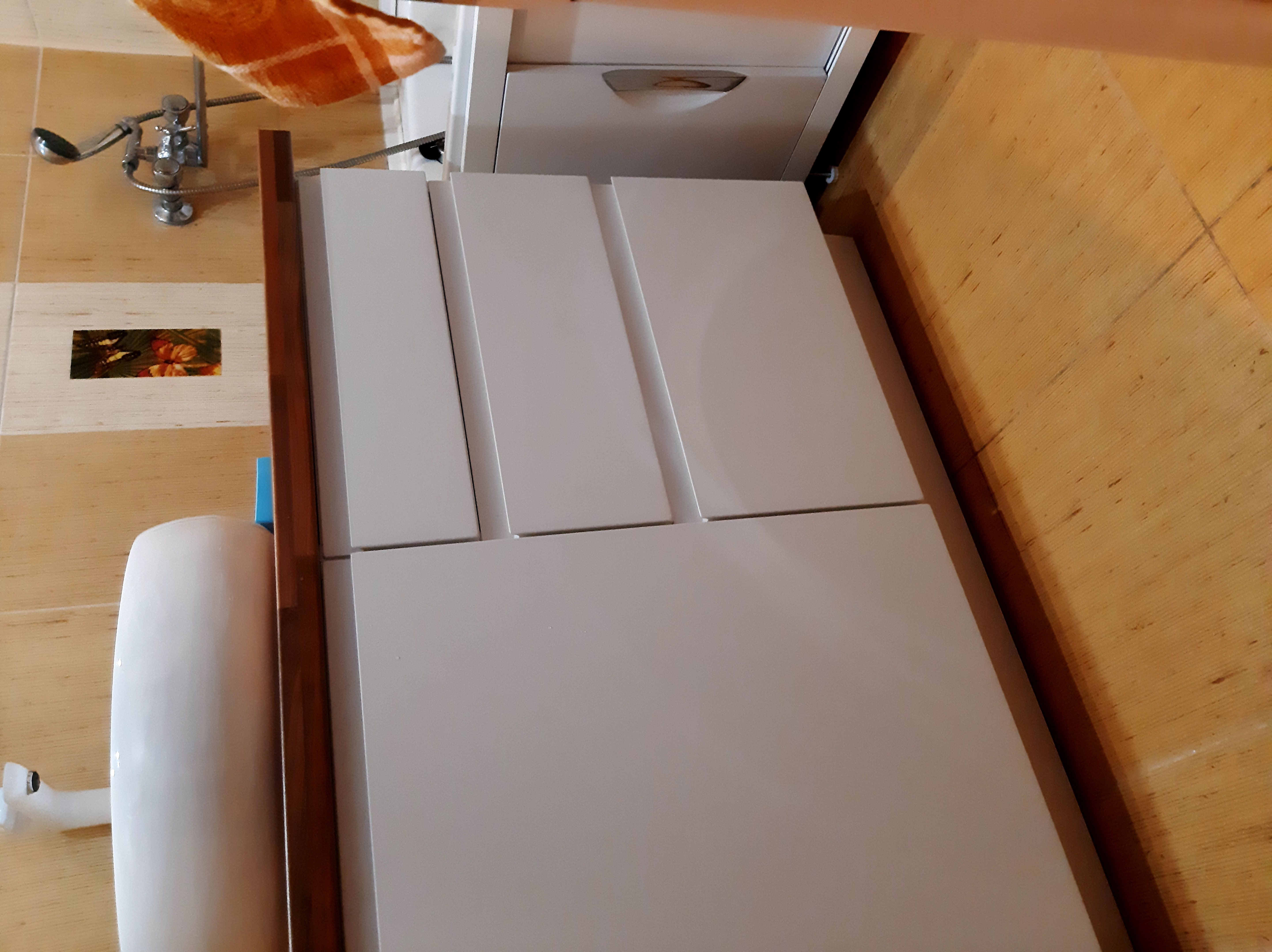 Выполнена в белом цвете. 2 выдвижных ящика, ниша под стиральную машину.