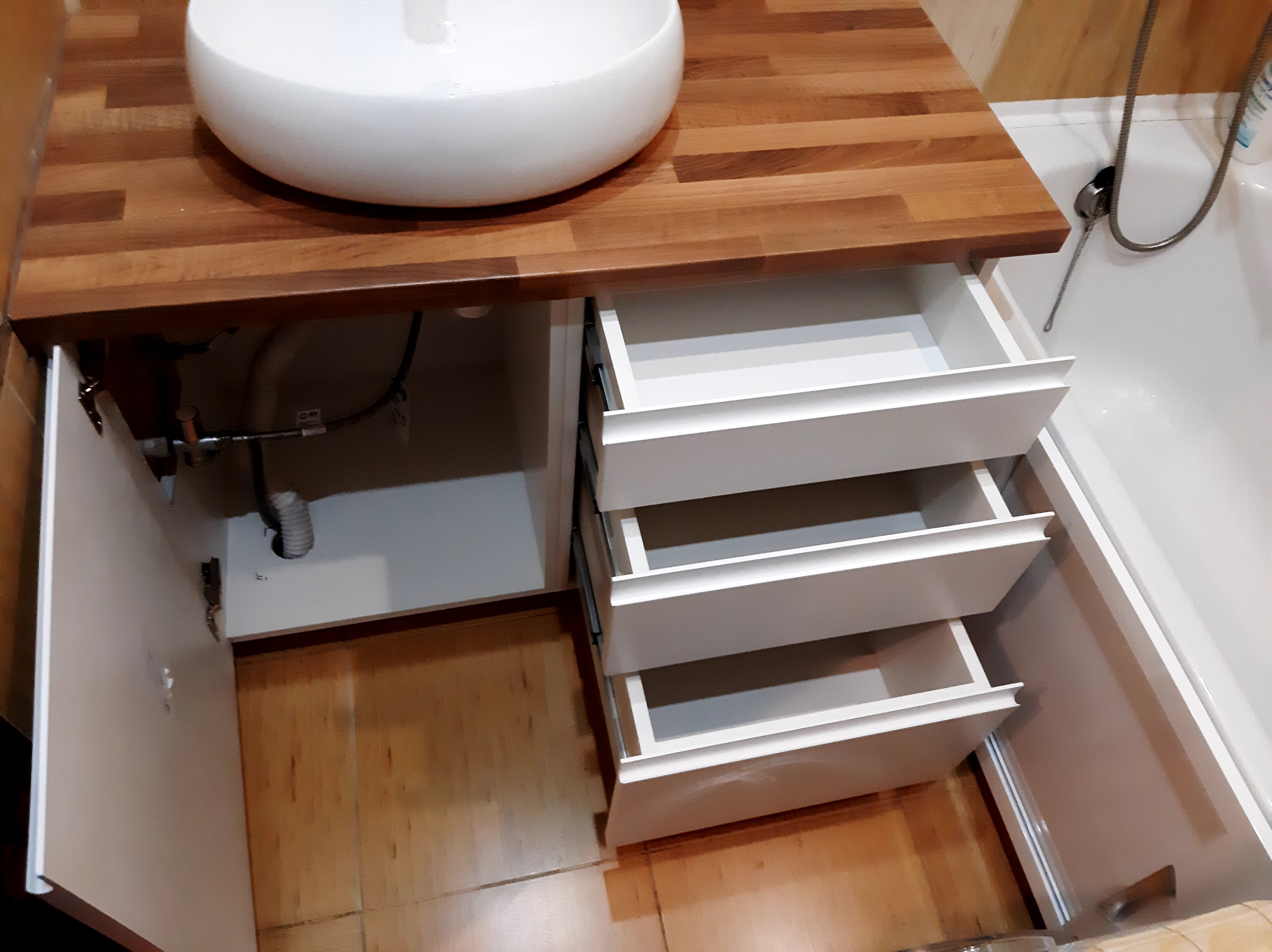 3 выдвижных ящика и 3 открытые ниши для мелких ванных принадлежностей.