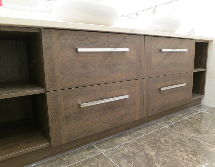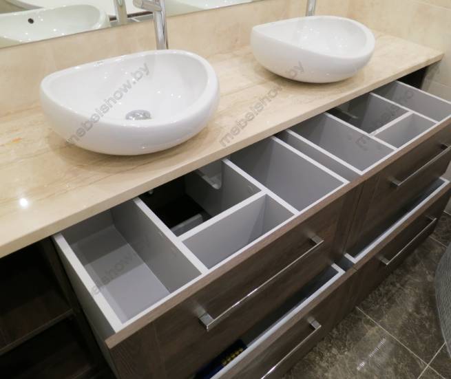 Представленная тумба в ванную выполнена с учетом размещения двух отдельных умывальников. Модель изготовлена из ДСП Эггер в цвете «Дуб Гладстоун Табак». Столешница выполнена из натурального мрамора. Выдвижные ящики работают на скрытой системе «Tandem» (Blum, Австрия).