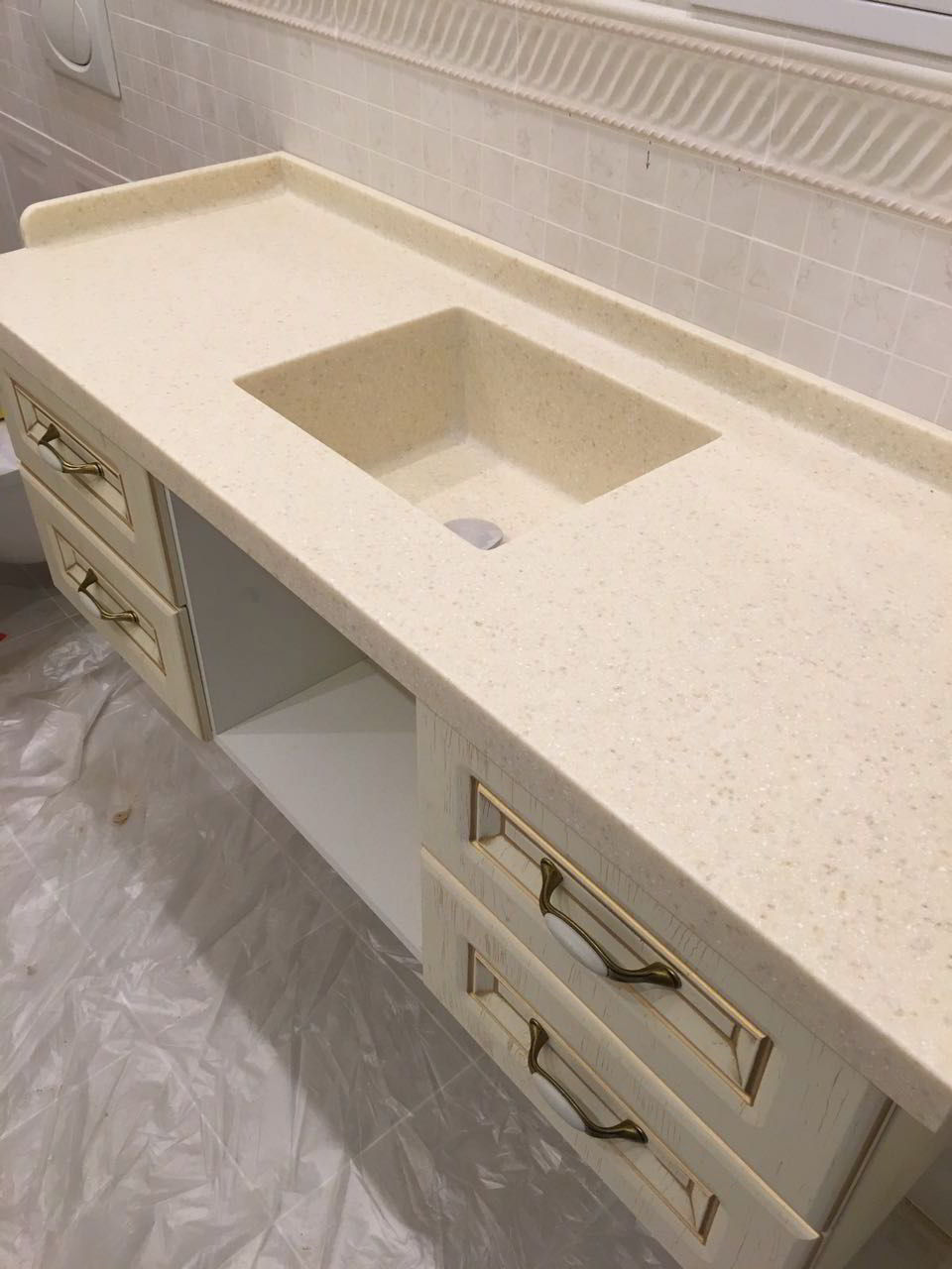 код 118526Широкая столешница с раковиной, выдвижные ящики.