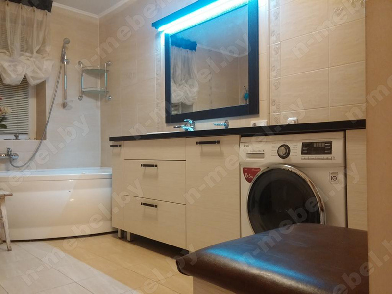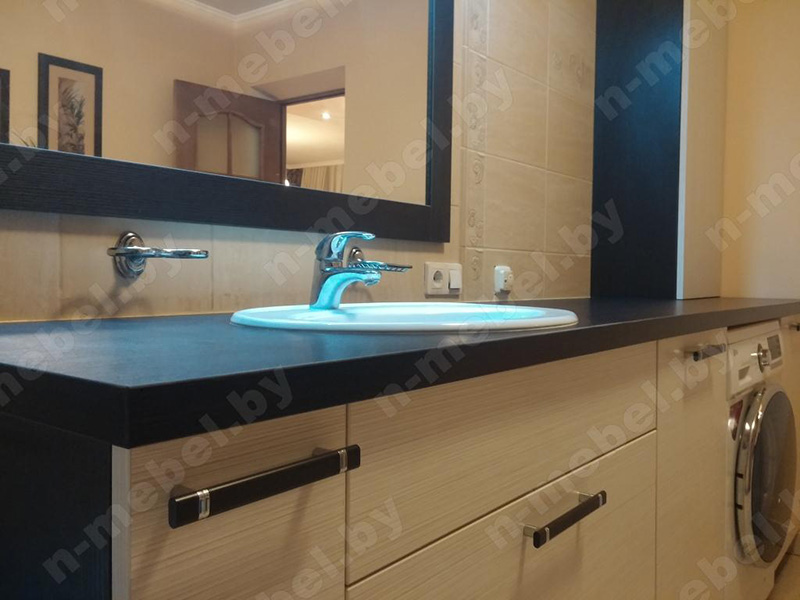 Вместительная тумба, предназначенная для ванной комнаты, выполнена в современном стиле. В составе модели имеется несколько распашных и выдвижных отделов. Каждая из створок укомплектована удобными ручками, выполненными в одном тоне со столешницей.