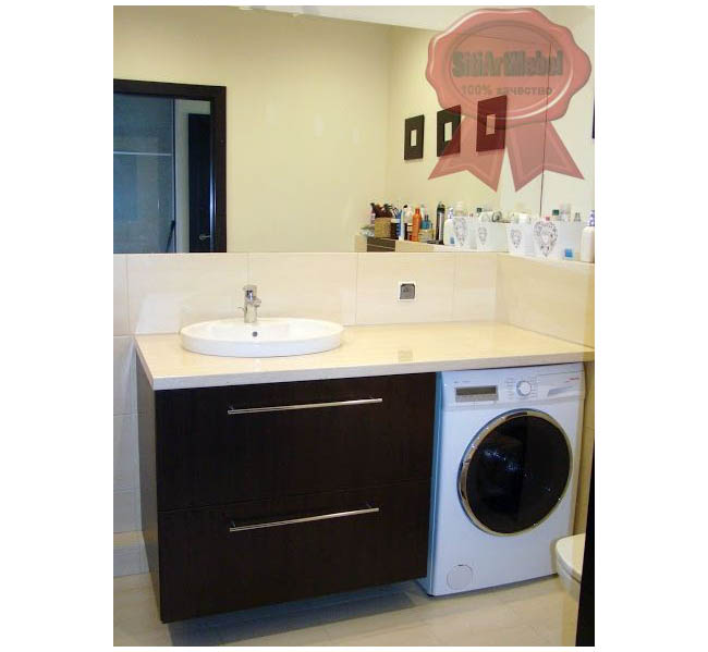 Современная модель отлично подойдет для большинства ванных комнат. Подвесная тумба имеет широкую столешницу, под которую также может быть установлена стиральная машина. Пара выдвижных ящиков позволяет организовать комфортное хранение полотенец, халатов, белья и прочих принадлежностей для ванны.
