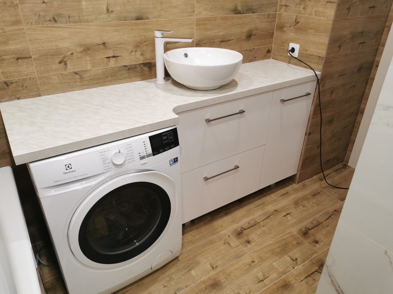Тумба в белом матовом корпусе с большой толщиной стенок.