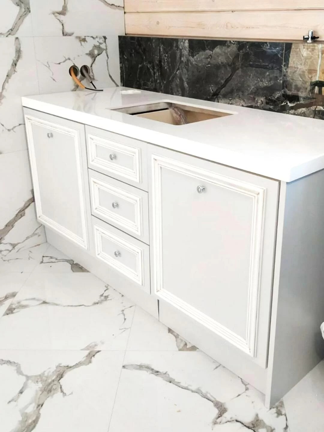 Фасады: МДФ краска матовая с наклеенными полиуретановыми молдингами с покраской и патиной
