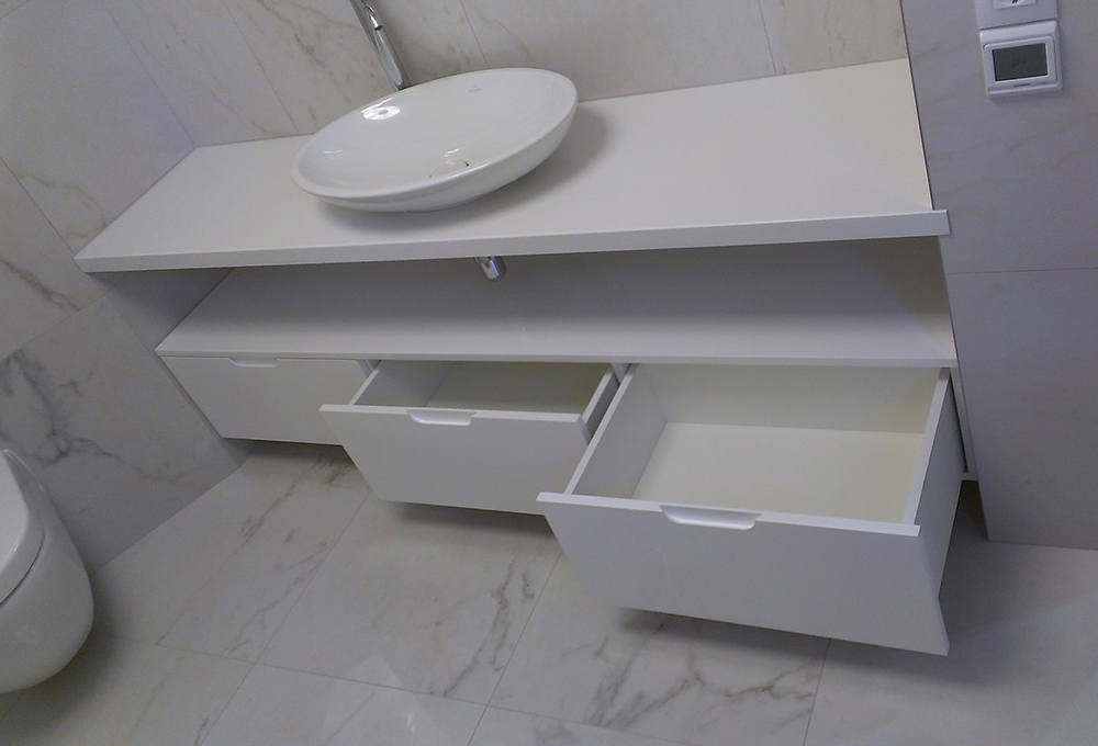 Между навесной полочкой и нижними ящиками создается значительное пространство, которое можно использовать для размещения разнообразных ванных принадлежностей. Нижние ящики выдвигаются при помощи неординарной фурнитуры.
