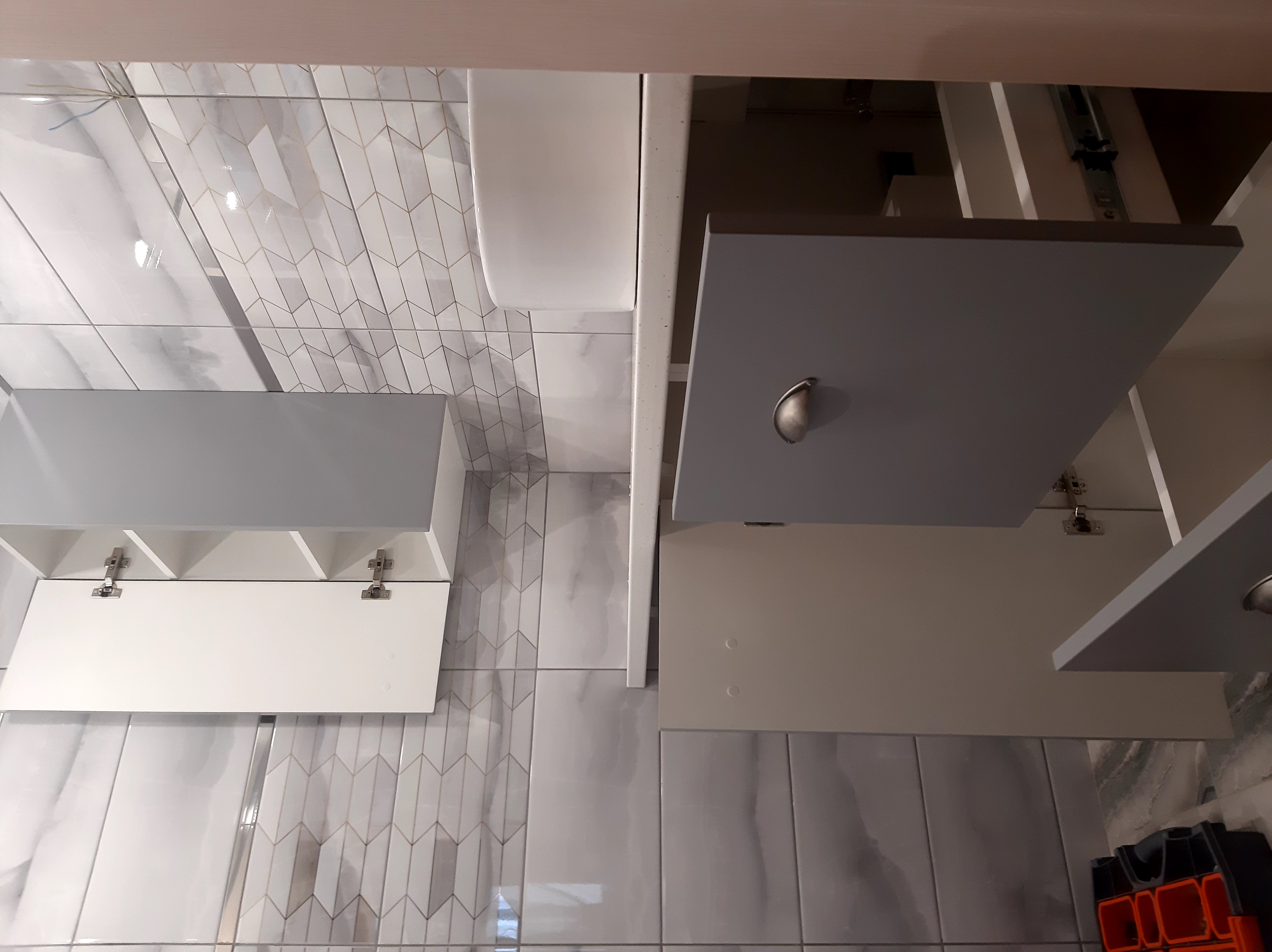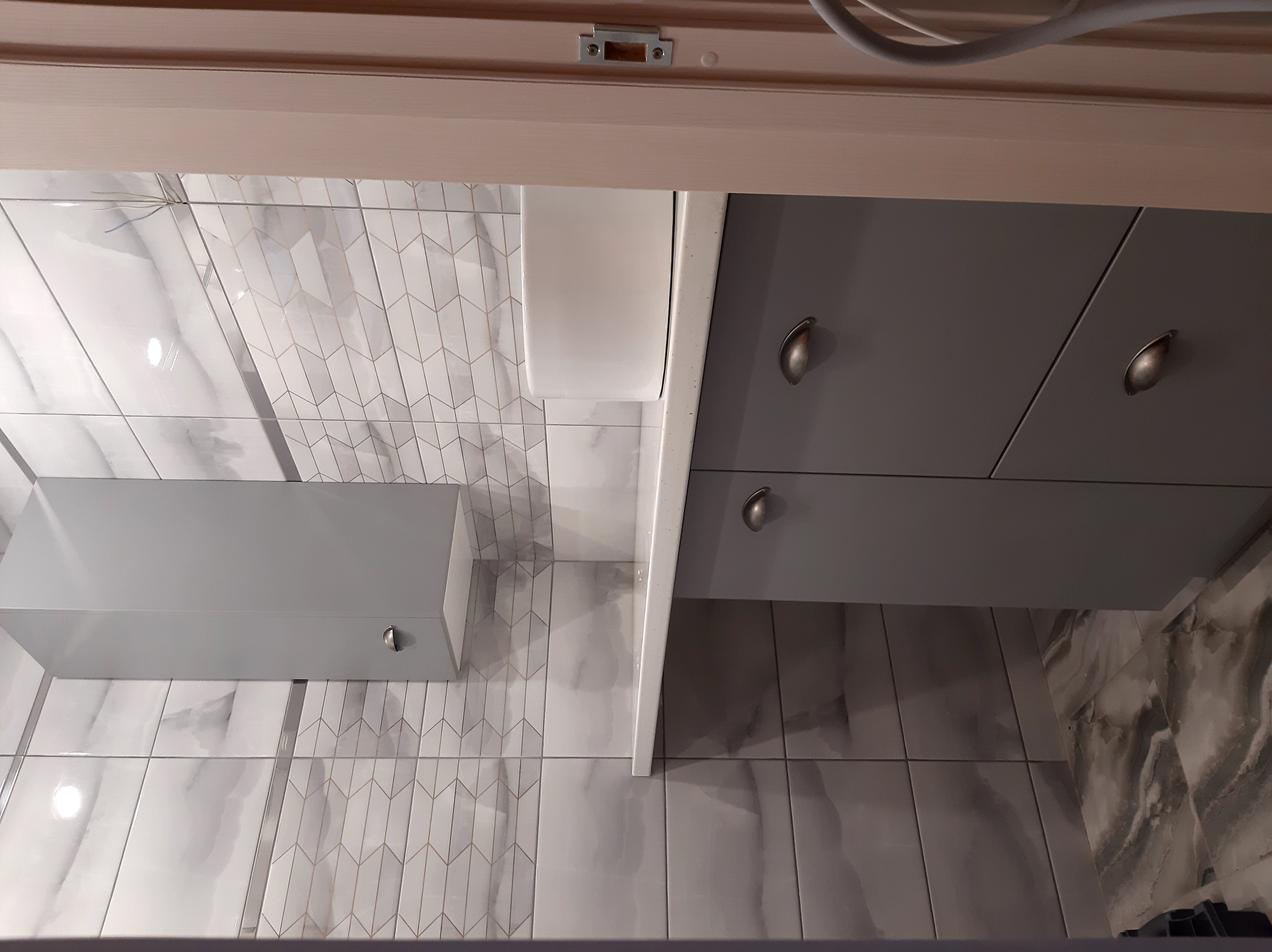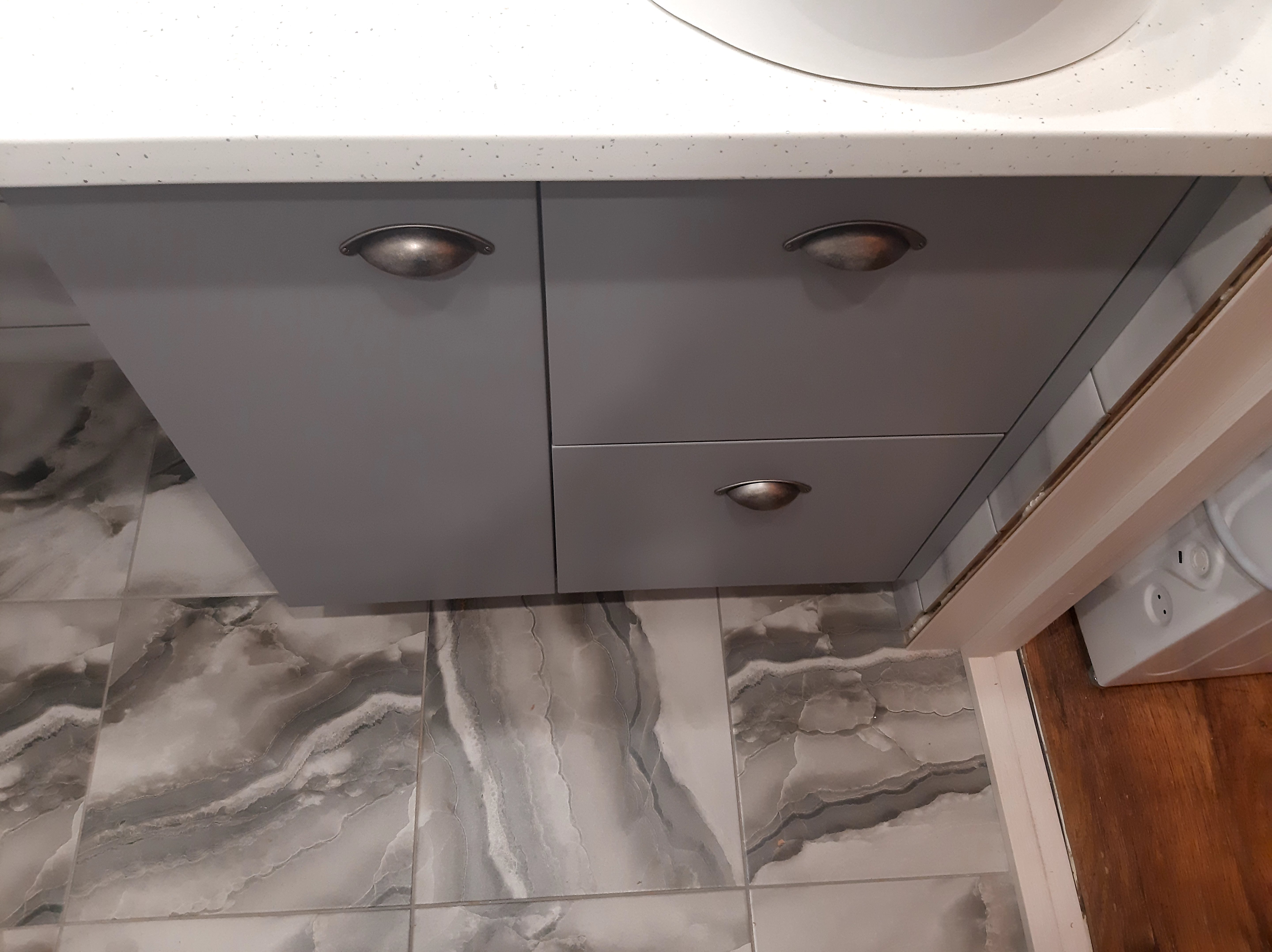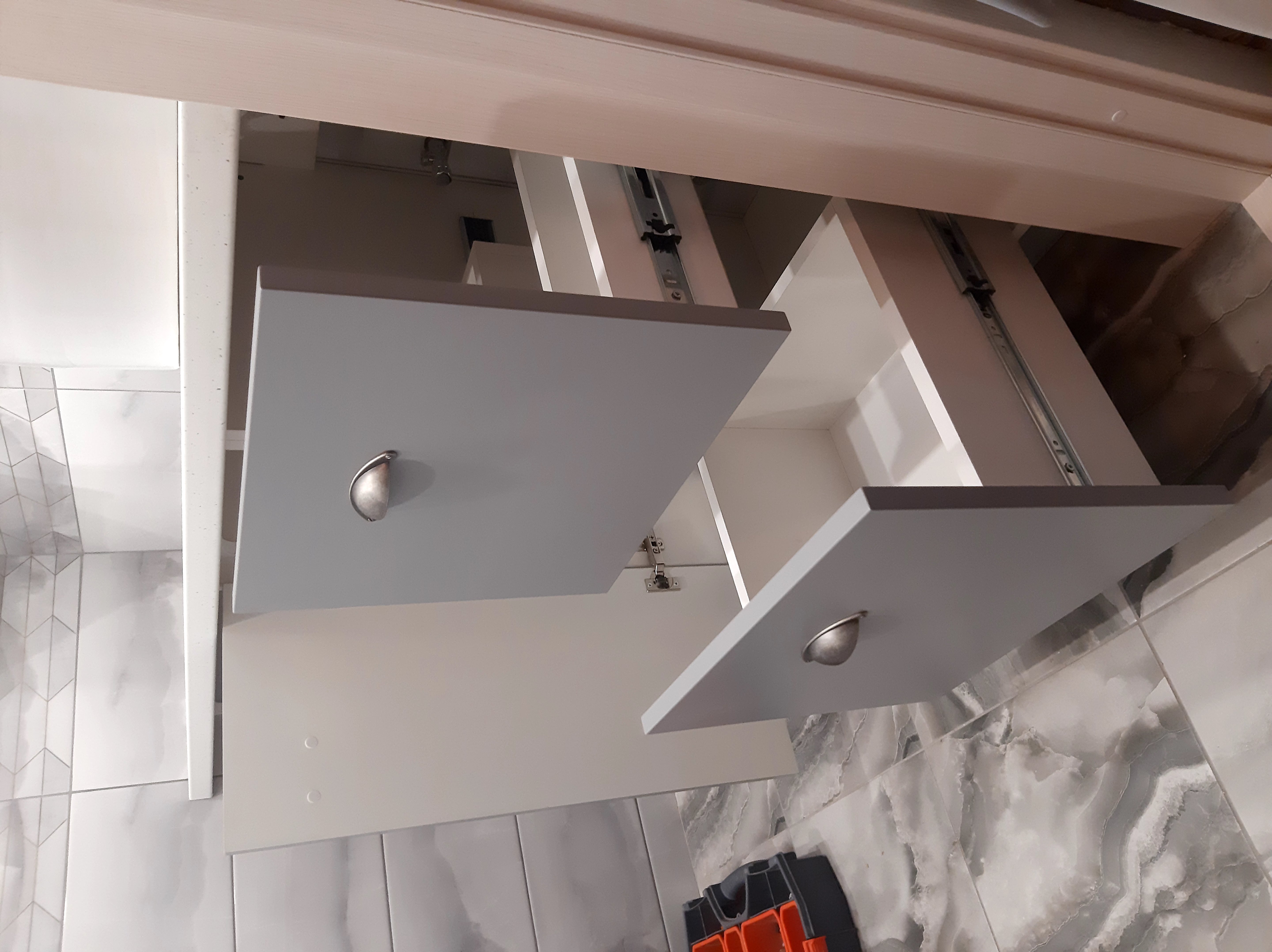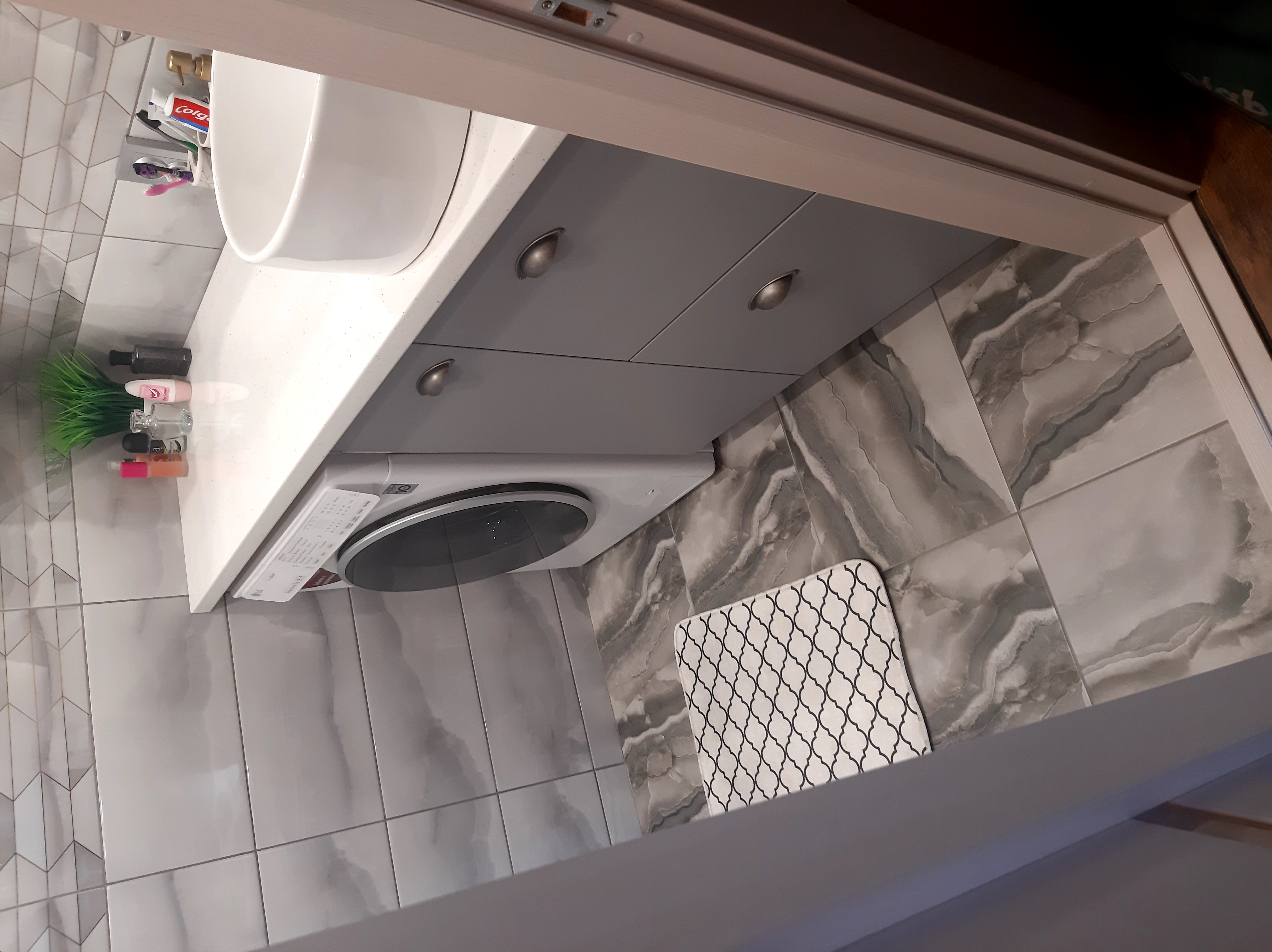 Интегрированные ручки, четыре выдвижных ящика, ниша для стиральной машинки.