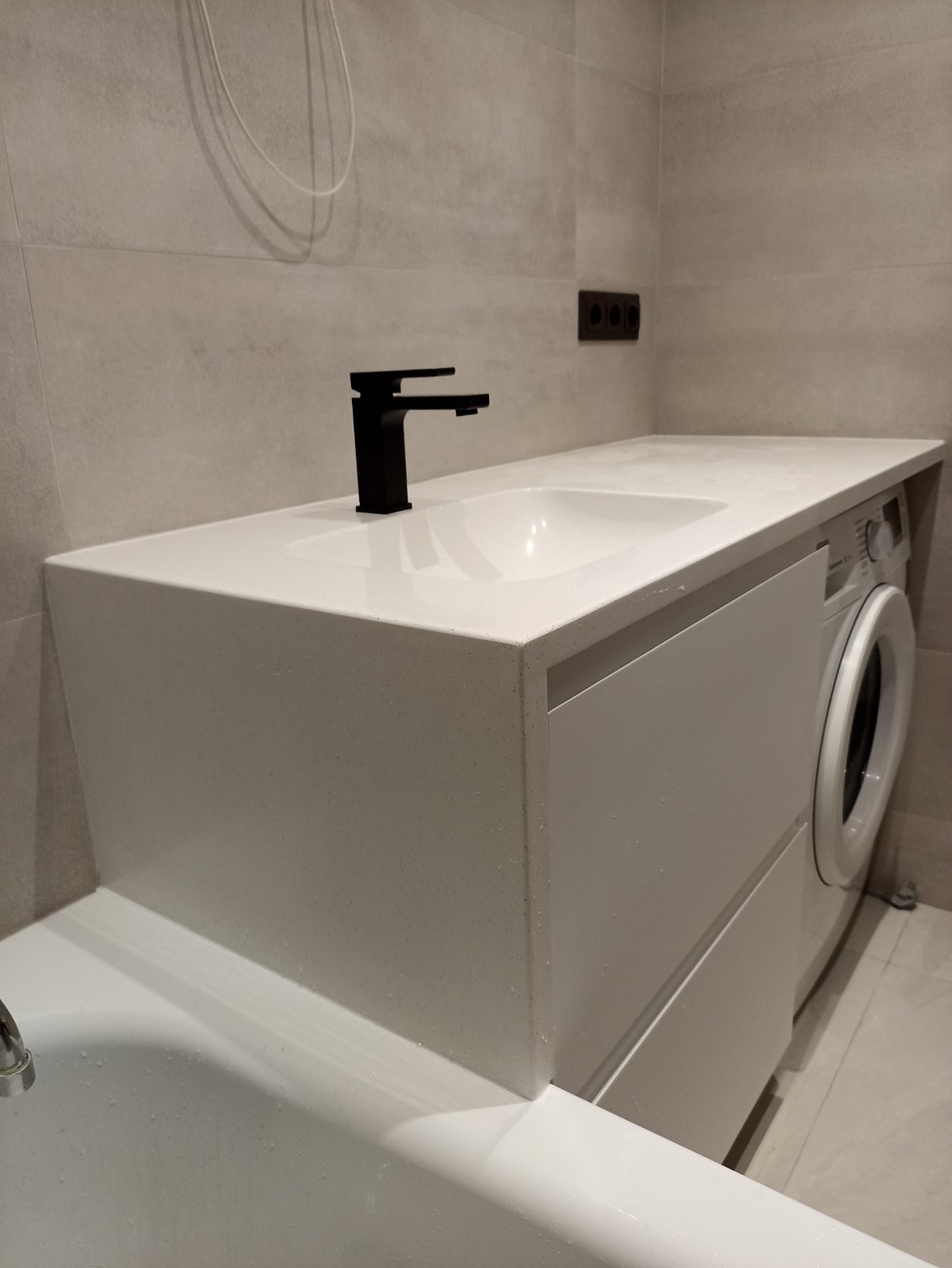Оснащена выдвижными ящика, полкой и нишей для стиральной машины. Может дополняться навесным шкафчиком.