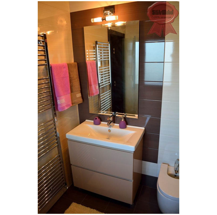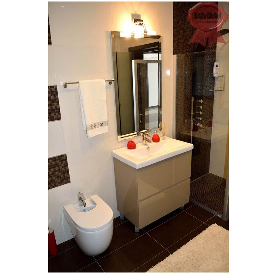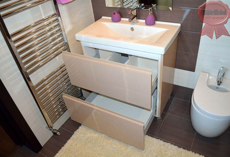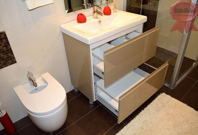Миниатюрная глянцевая тумбочка станет прекрасным дополнением для ванной комнаты, повышающим комфорт от ее использования. Стандартная конструкция выступает в качестве основания под устанавливаемую чашу умывальника. Внутри тумбы оборудовано место для хранения полотенец и предметов гигиены. Модель имеет светлую расцветку.
