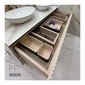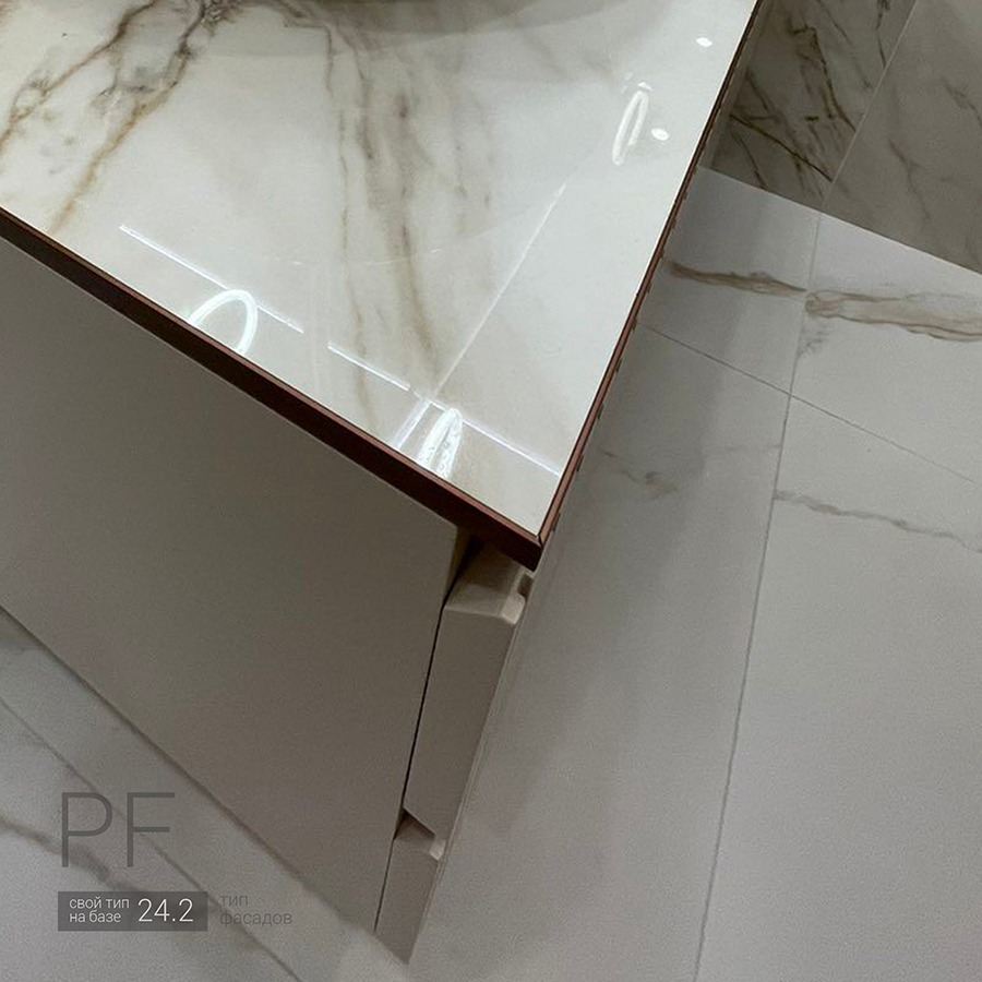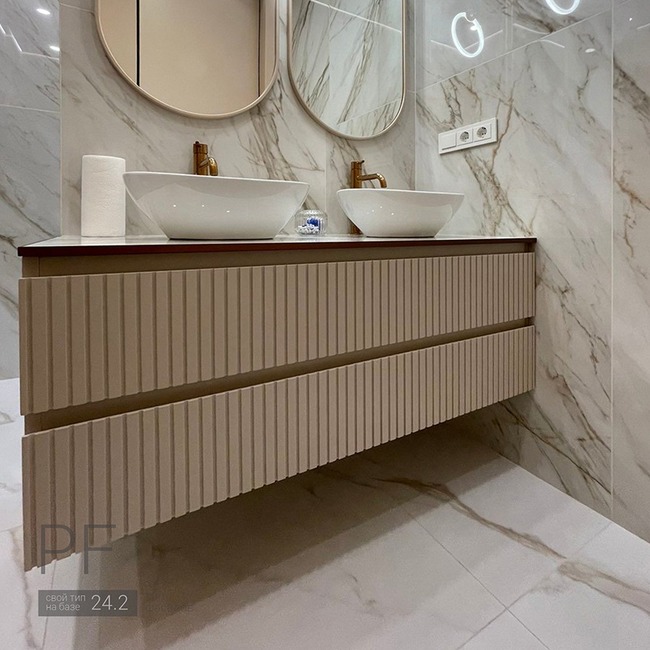 Удобная современная тумба в ванную для двух умывальников. Цвет тумбы гармонично вписался в интерьер и добавил в него чувственного шика. Рифленые фасады из серии «волна» наполняют пространство энергией. По запросу клиента ширина шага «волны» была изменена и с торца сделан скос, который выполняет роль потайной ручки. Не смотря на сантехнические коммуникации, внутреннее пространство верхней шуфляды выглядит красиво, оно удобно в использовании, задействован каждый сантиметр.