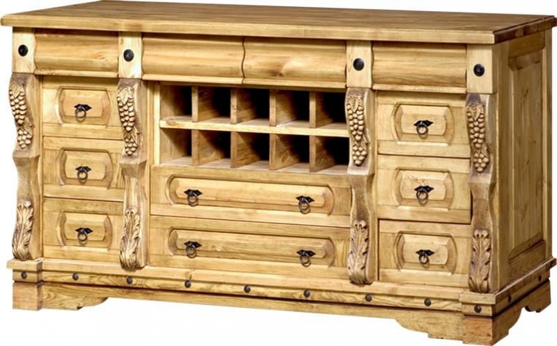 Тумба из массива в аутентичном стиле с резными элементами в виде листьев и виноградных гроздей. По краям расположены по три небольших выдвижных ящика, по центру - две шуфлядки и винные полки под самой крышкой.