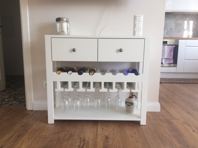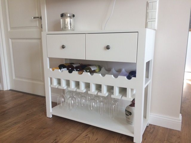 Минималистичная тумба с полкой для винных бутылок и держателями для фужеров.