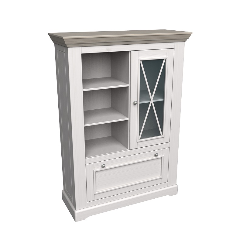 Высокий, светлый комод с остекленной витриной.