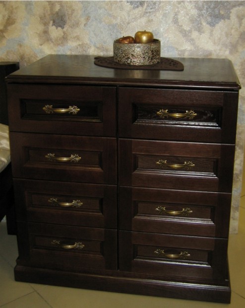 Комод из массива изготавливается в строгом стиле. Конструкция оснащается выдвижными полками на направляющих. Размер и комплектация предмета мебели оговариваются с заказчиком. На выбор покупателя также представляется 14 вариантов тонировки древесины.