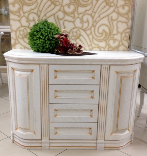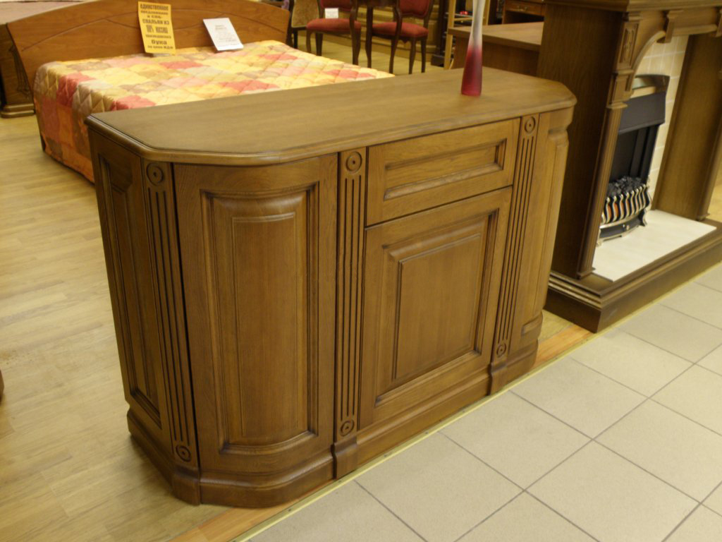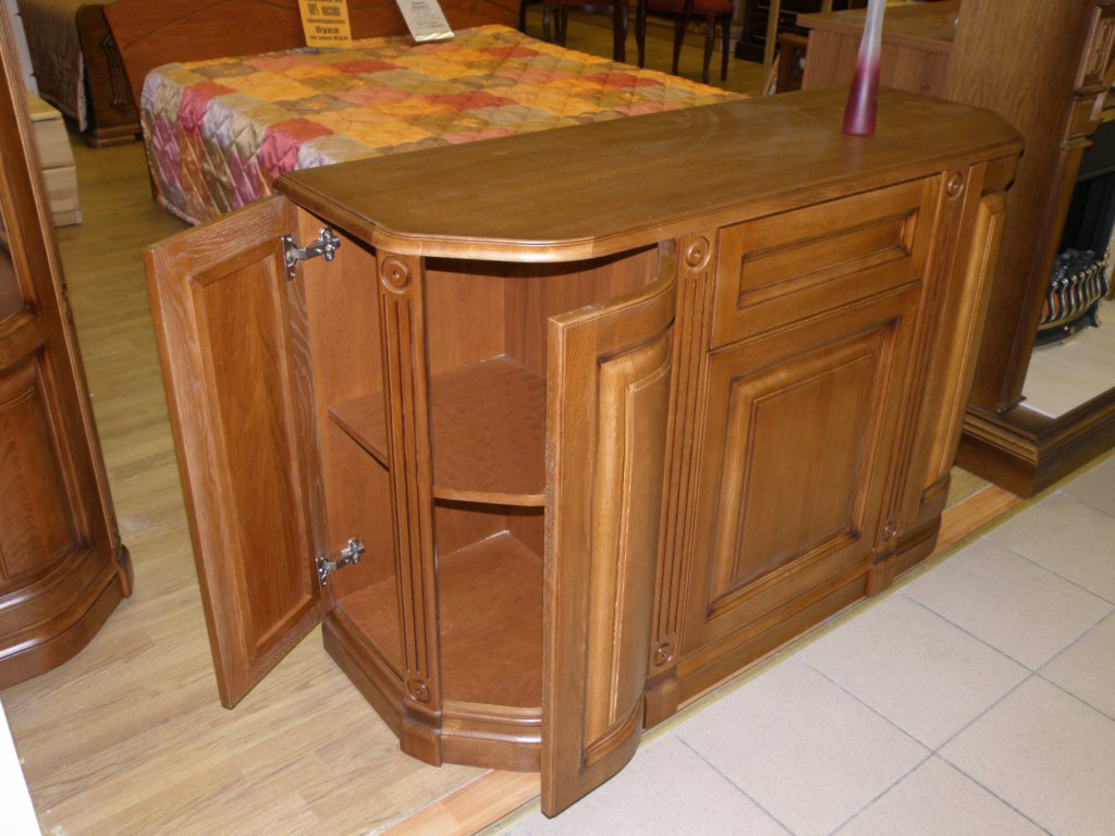 Представленная модель комода оснащена боковыми радиусными створками. Предмет мебели исполняется из натурального массива дуба. Фасад украшен резными элементами. 14 вариантов тонировки позволяет выбрать подходящий цвет именно для вашего интерьера.