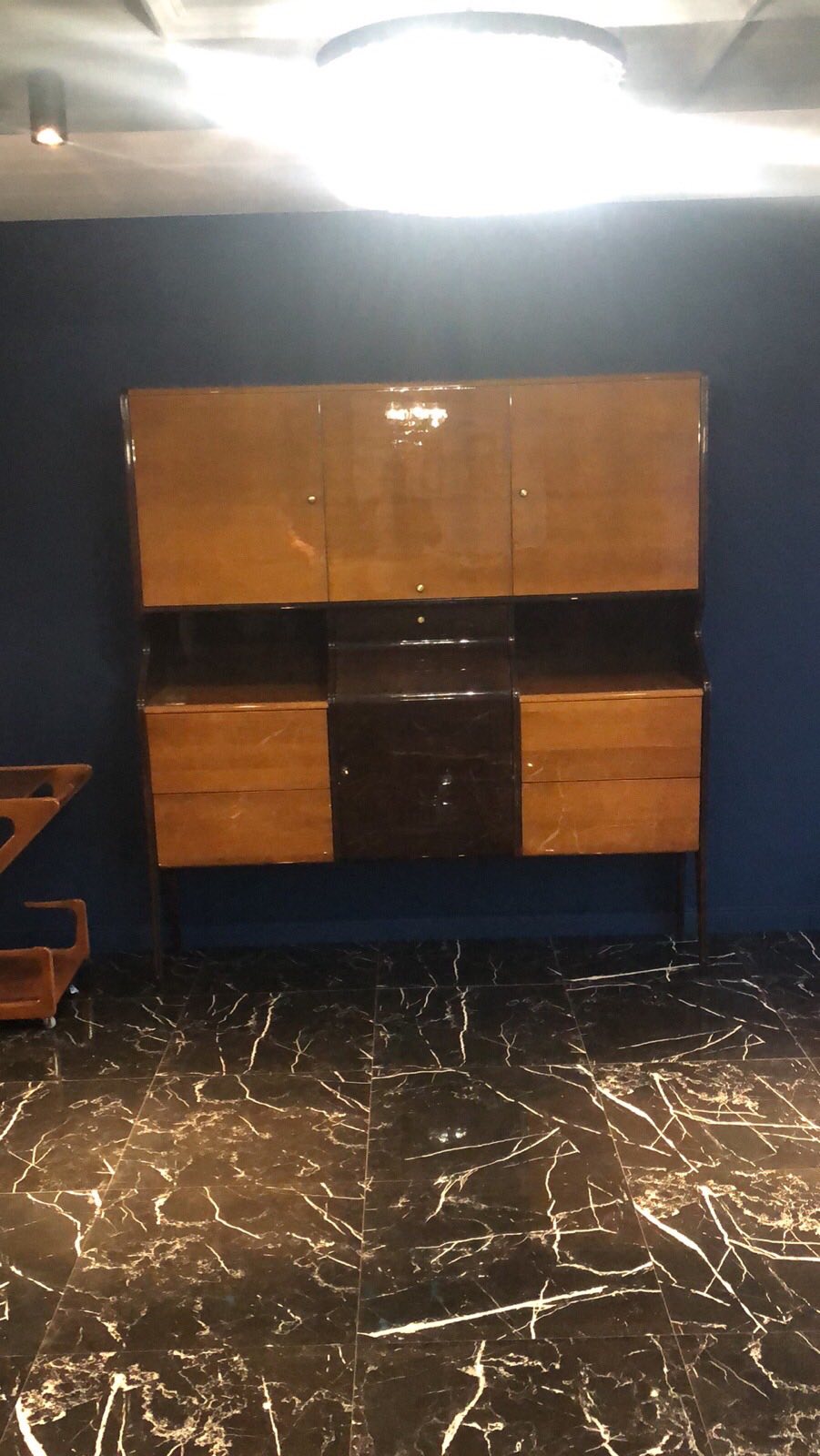 Тумба имеет нишу с полками, стеклянную дверь и откидную дверь.