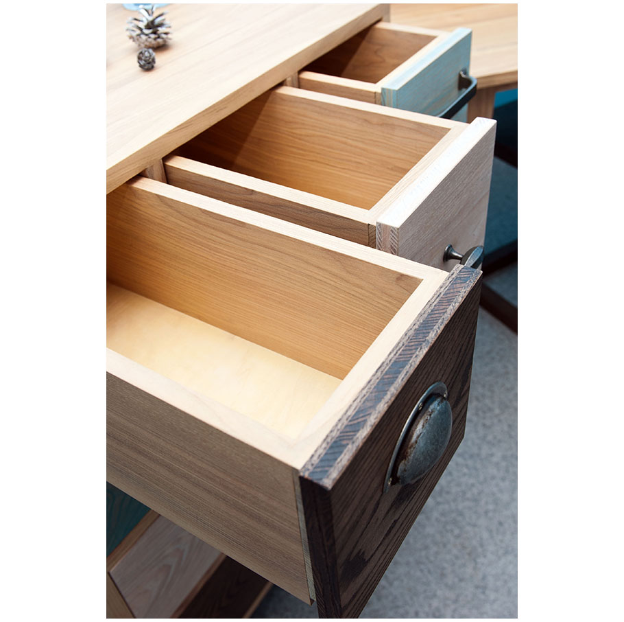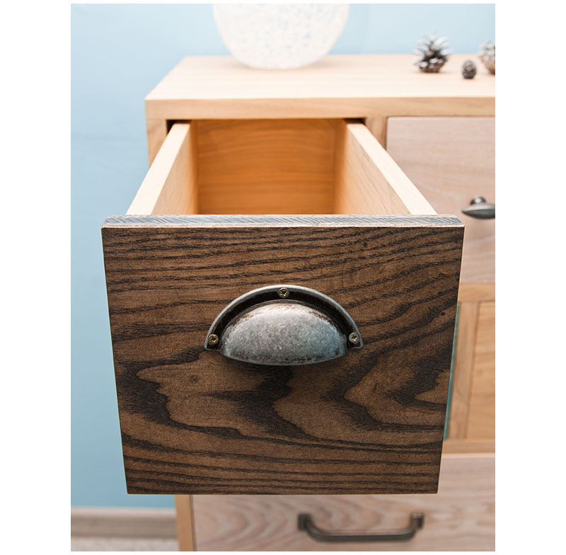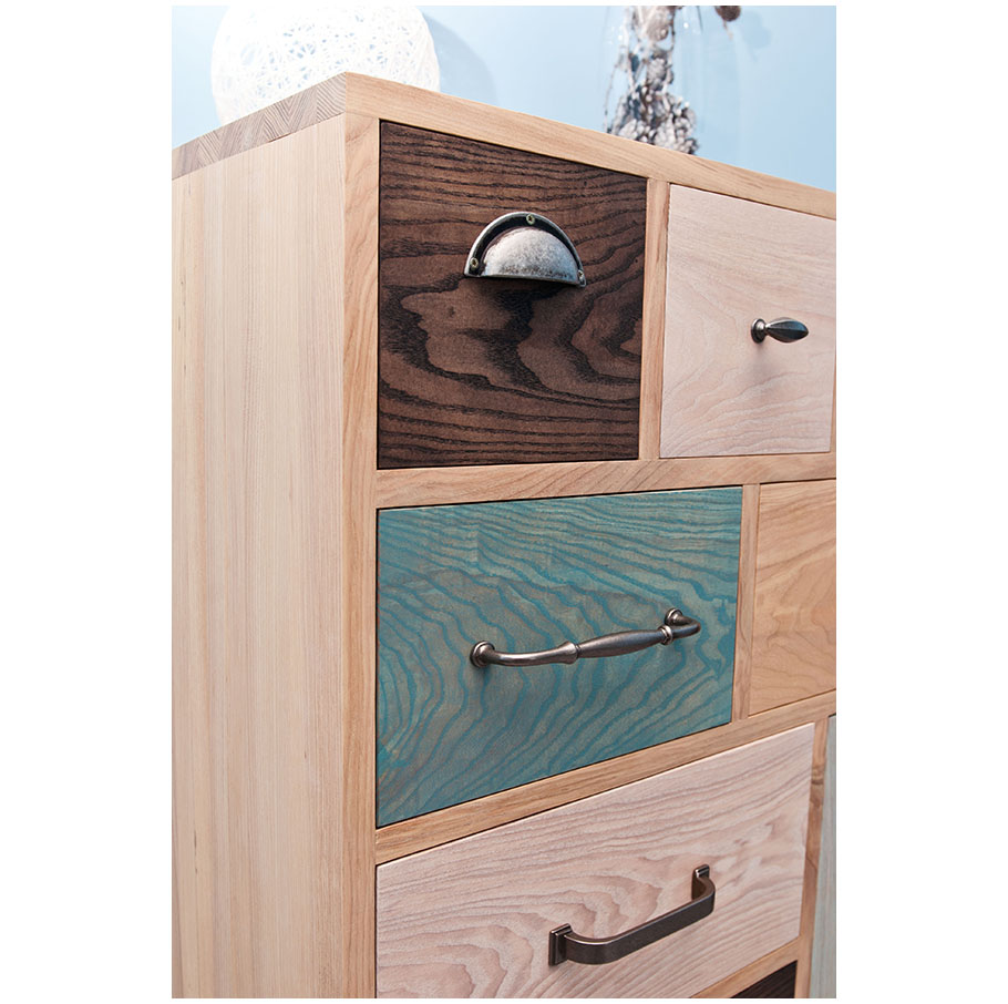 Современный комод с разноцветными ящиками будет прекрасно смотреться в интерьере спальни или гостиной. Каждая створка выдвижных ящиков украшена оригинальной ручкой, которая очень удобна в использовании. Изделие покрыто специальным маслом, защищающим поверхность от влаги и других негативных факторов.