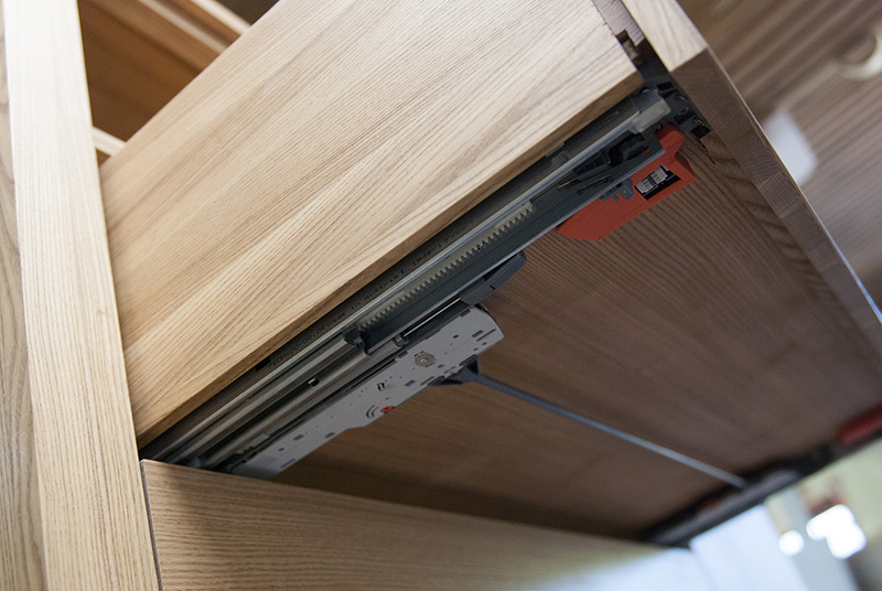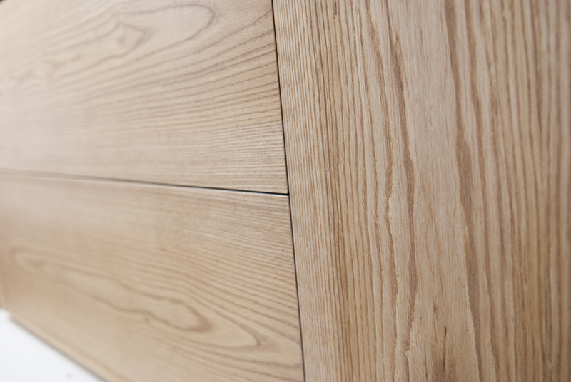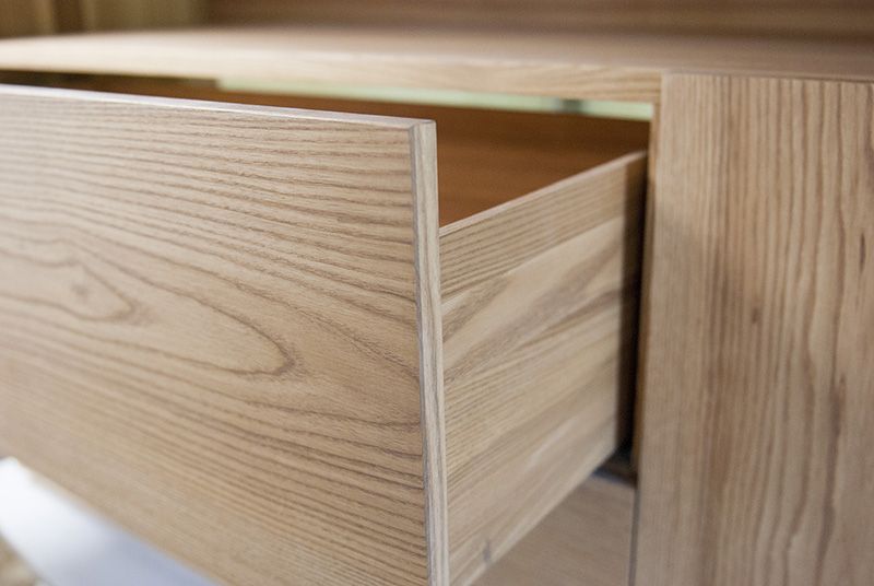 Комод изготовлен из массива ясеня с использованием современной фурнитуры Blum. Поверхность изделия покрыта специальным маслом, защищающим мебель от воздействия негативных факторов. Предусмотрено наличие двух выдвижных ящиков, распашной тумбы и открытой полочки.