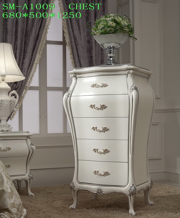 Этот классический вариант подойдет для вашей спальни в стиле Ампир или Рококо. Комод разделен на пять выдвижных ящиков, установлен на ножки, выполненные в одном цвете с фасадом. Может быть изготовлен в различных цветовых решениях.
