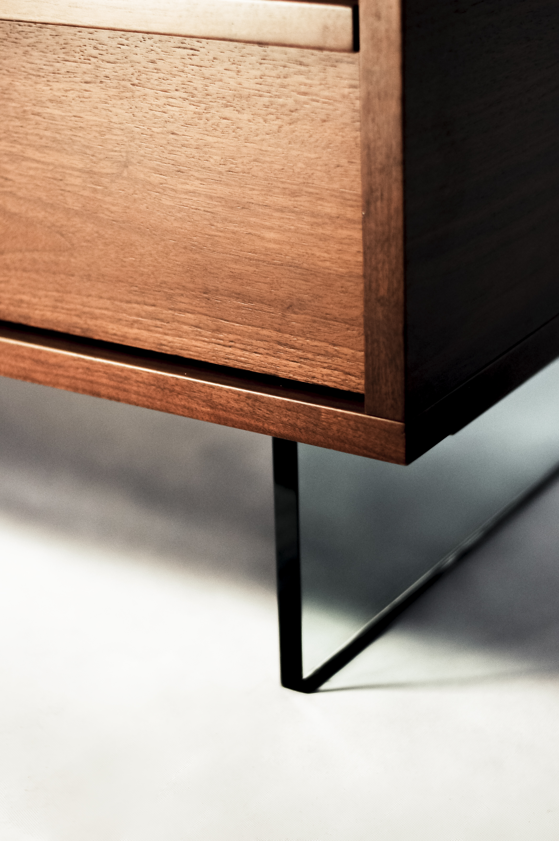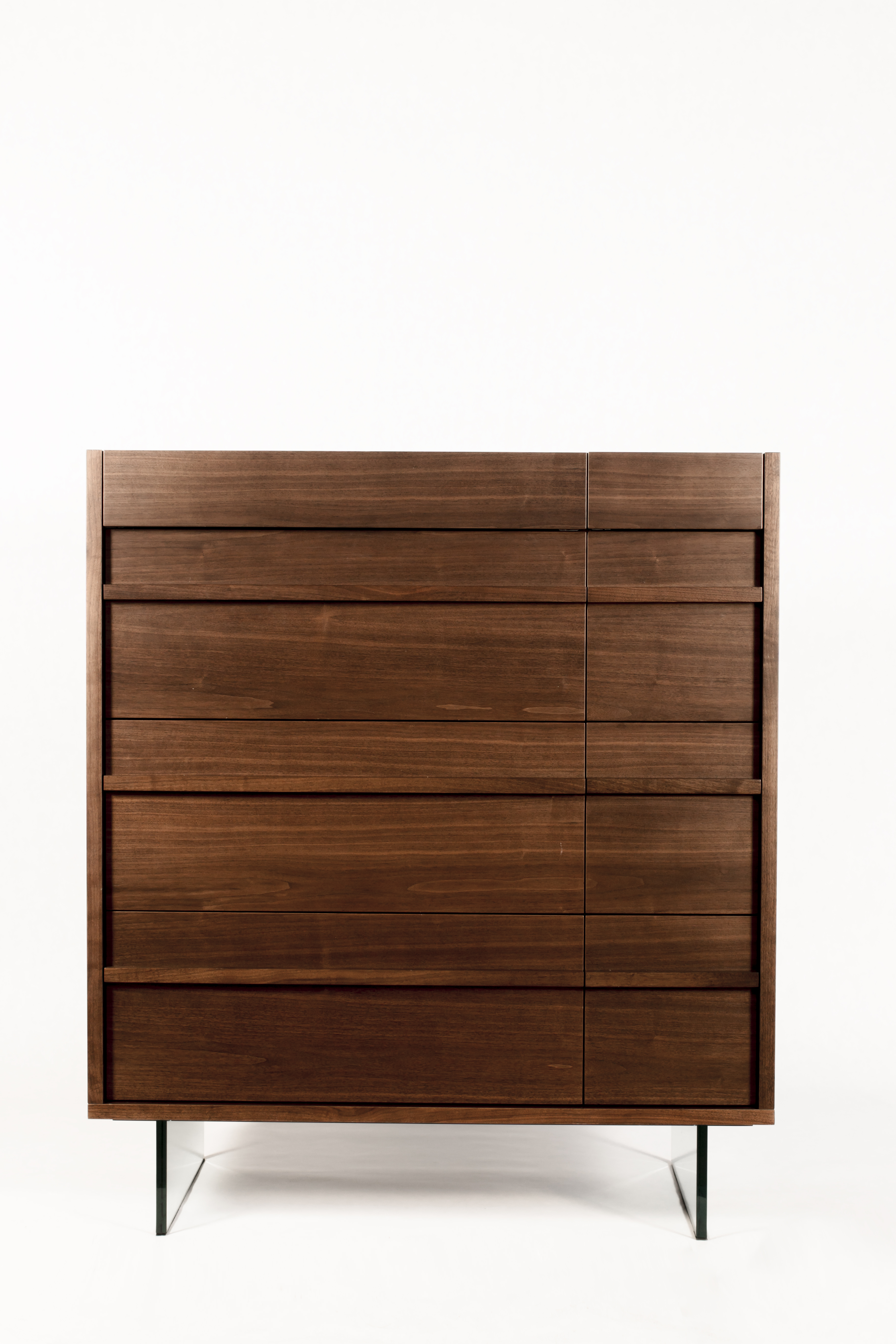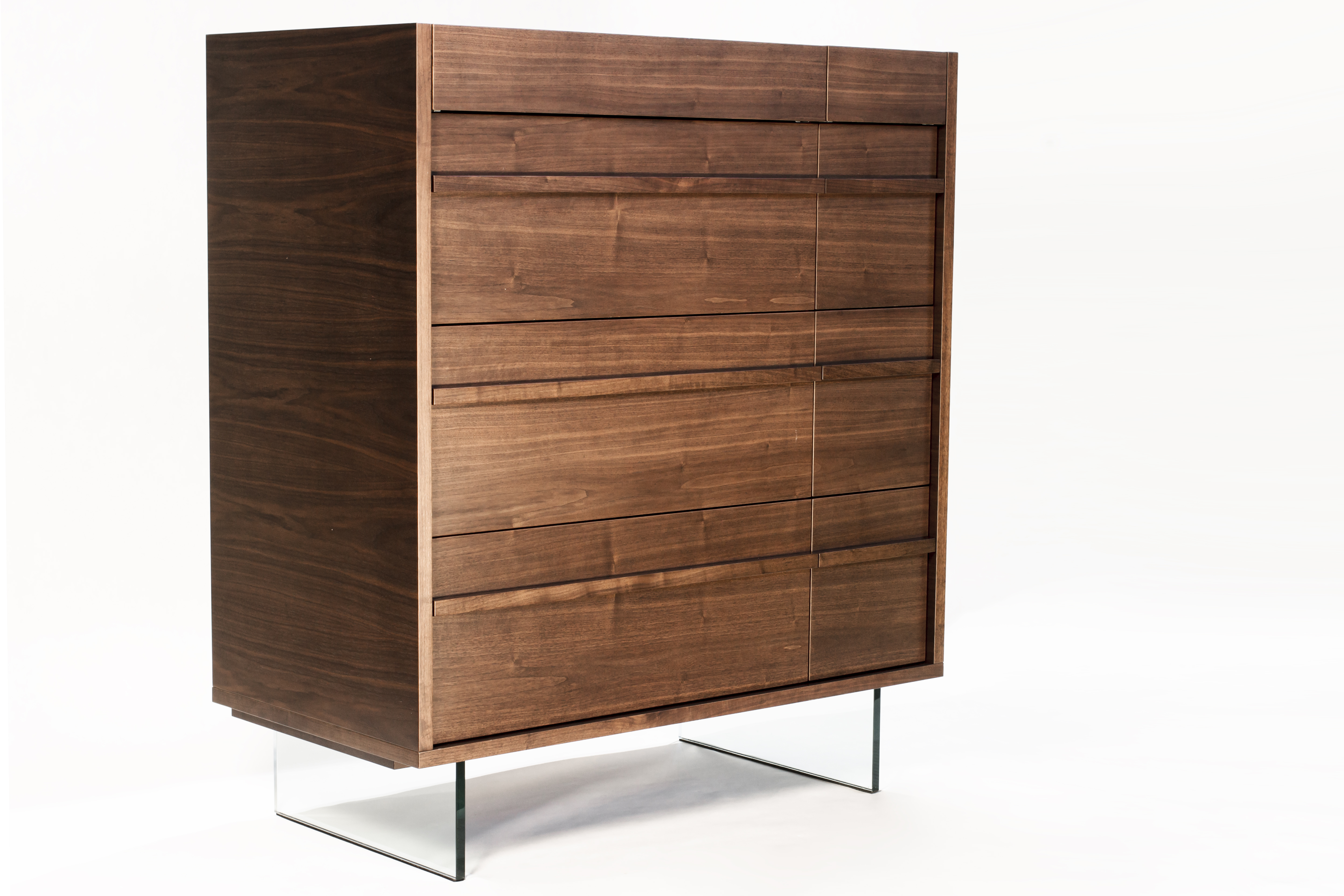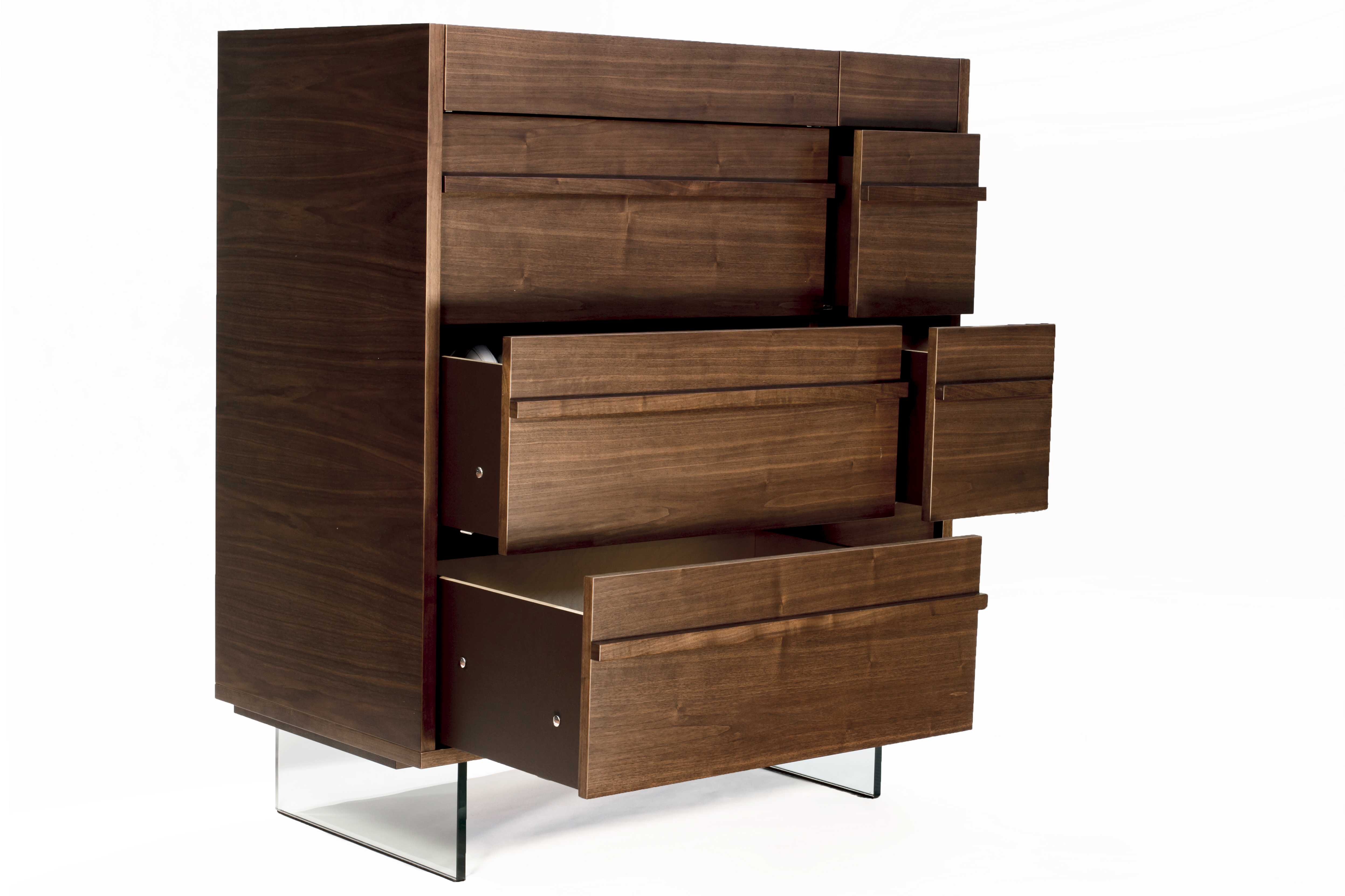 Изысканный комод отличается оригинальным дизайном ножек, которые выполнены из стекла. Комод представляет собой функциональную модель со множеством разнообразных выдвижных ящиков, не оснащенных ручками. Вместо ручек в дизайне используются небольшие планки, которые выполняют эстетическую и практическую функцию.