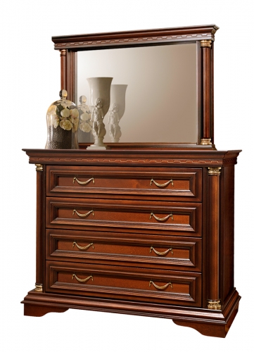 Классический комод с трюмо в расцветке темный орех с патинированием. Резные карнизы и основание, углы с колоннами, украшенными позолотой. Зеркало в прямоугольной раме, комод на четыре широких выдвижных ящика с поникающими ручками-скобами под бронзу.